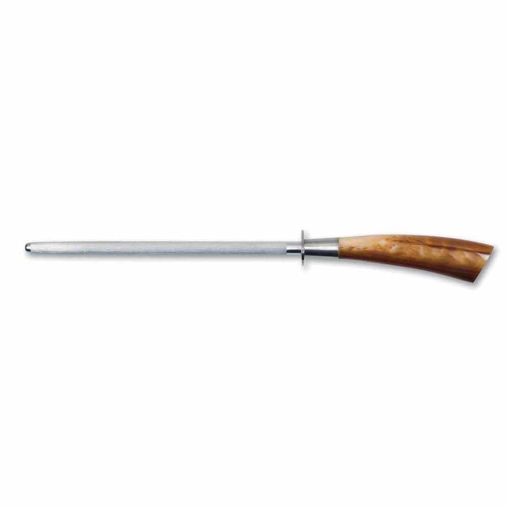 Puntenslijper : essentieel om uw messen altijd efficiënt te laten slijpen. Gesmede handgreep en verchroomde stalen kern die voldoende hardheid en duurzaamheid garandeert om de snede van uw roestvrijstalen messen te behouden. Gemaakt met volledig handvat, dwz het lemmet heeft de tang verborgen in het handvat. Volledig met de hand geproduceerd in kleine hoeveelheden en zonder taakverdeling, degenen die ermee beginnen, maken ze af.