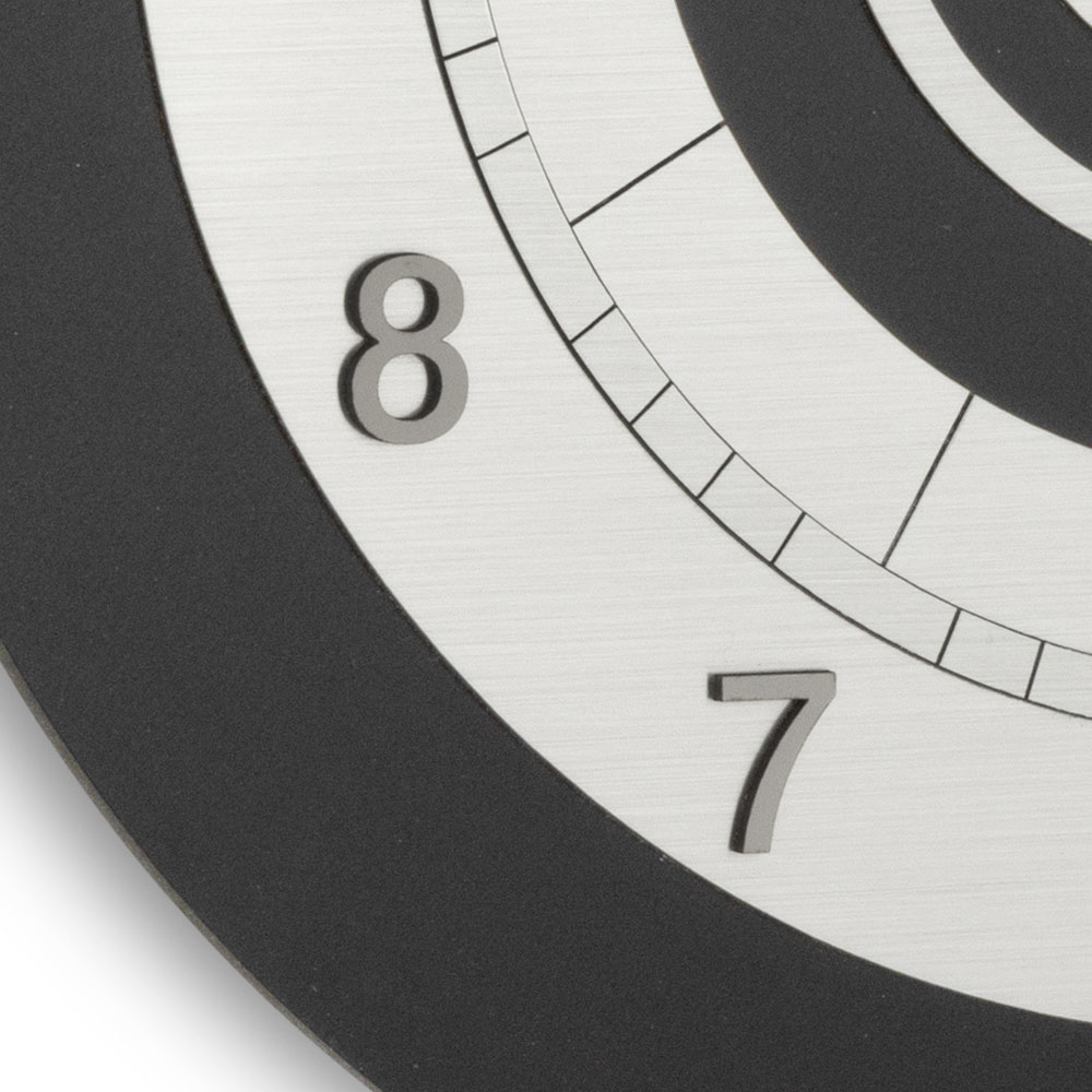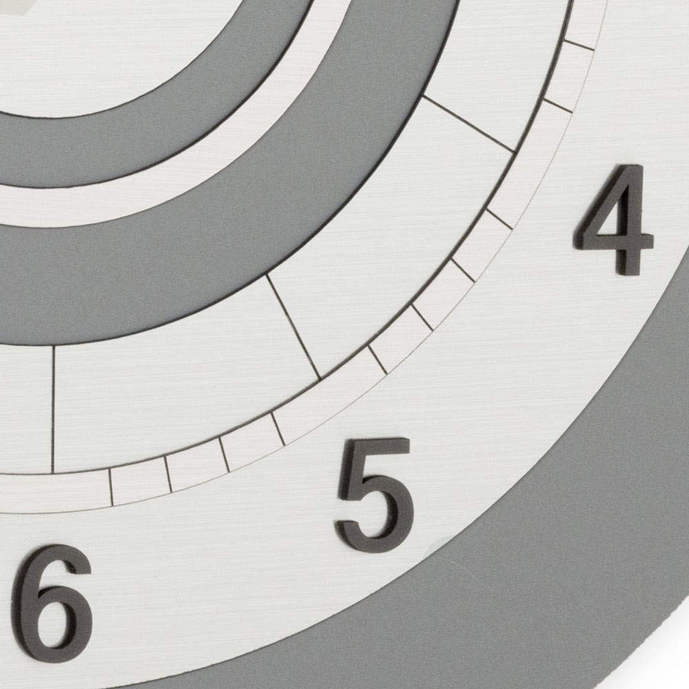 Het frame omarmt een wijzerplaat met in reliëf aangebrachte, elegante en goed leesbare cijfers. De subtiele wijzers en contrasterende kleuren creëren een balans tussen moderniteit en verfijning, perfect voor eigentijdse omgevingen, zowel thuis als professioneel.