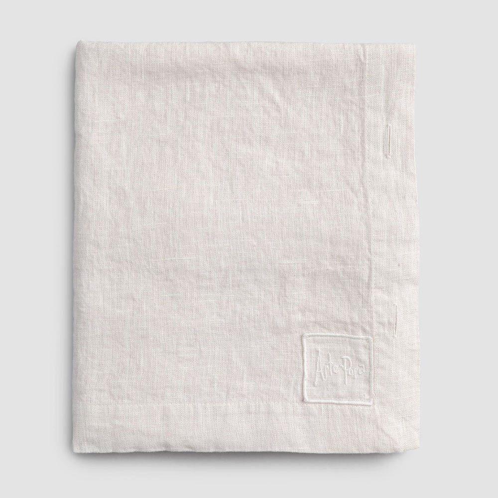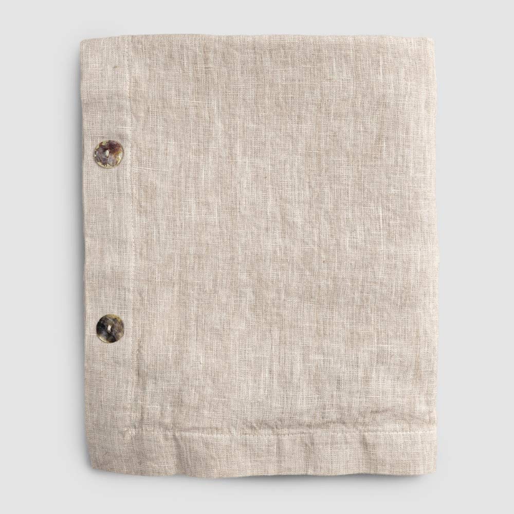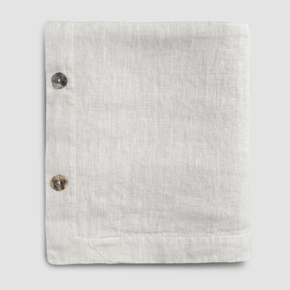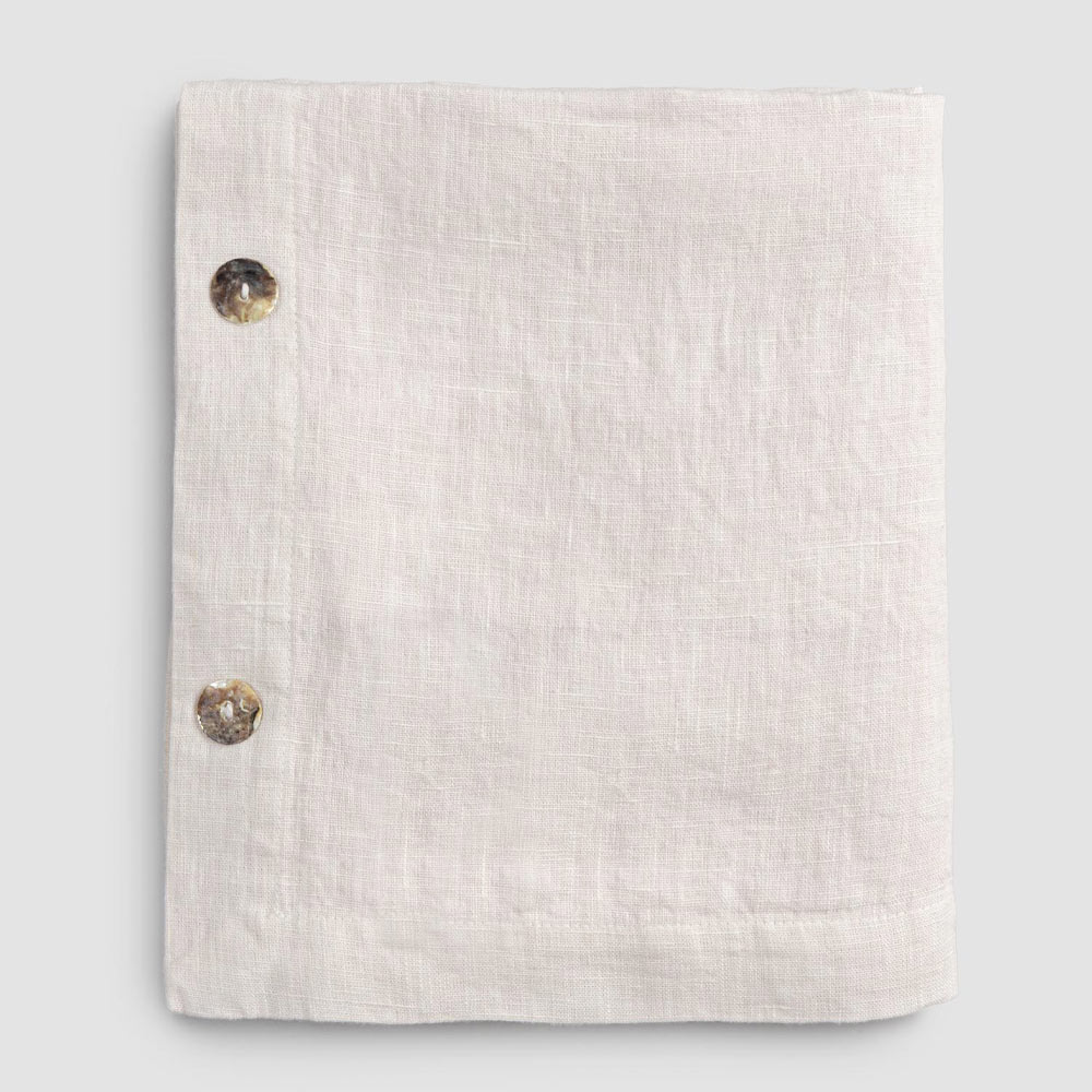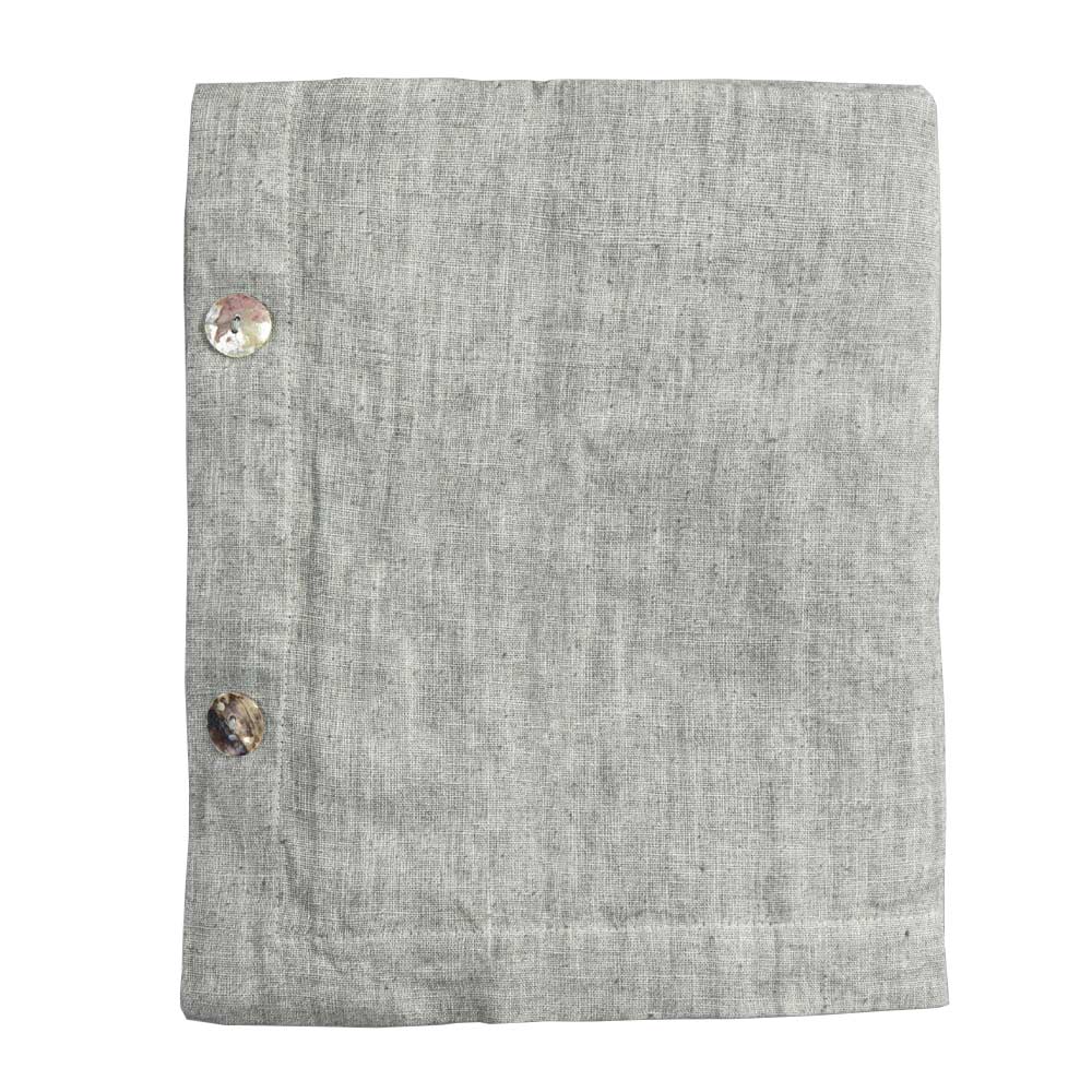 Modulair tafelkleed van gekleurd linnen met parelmoeren knopen, handgemaakte kwaliteit made in Italy.