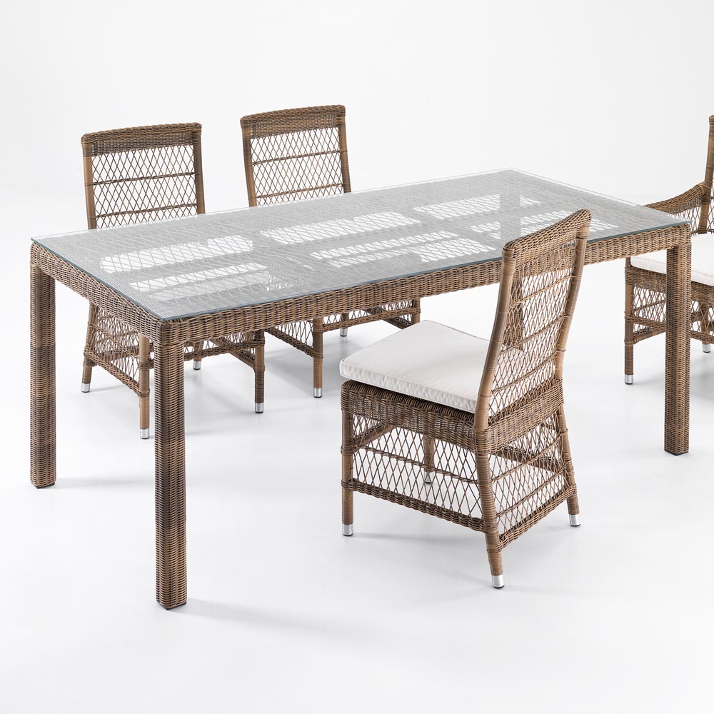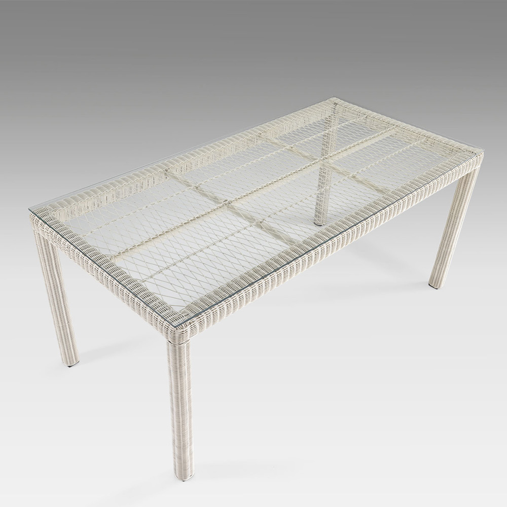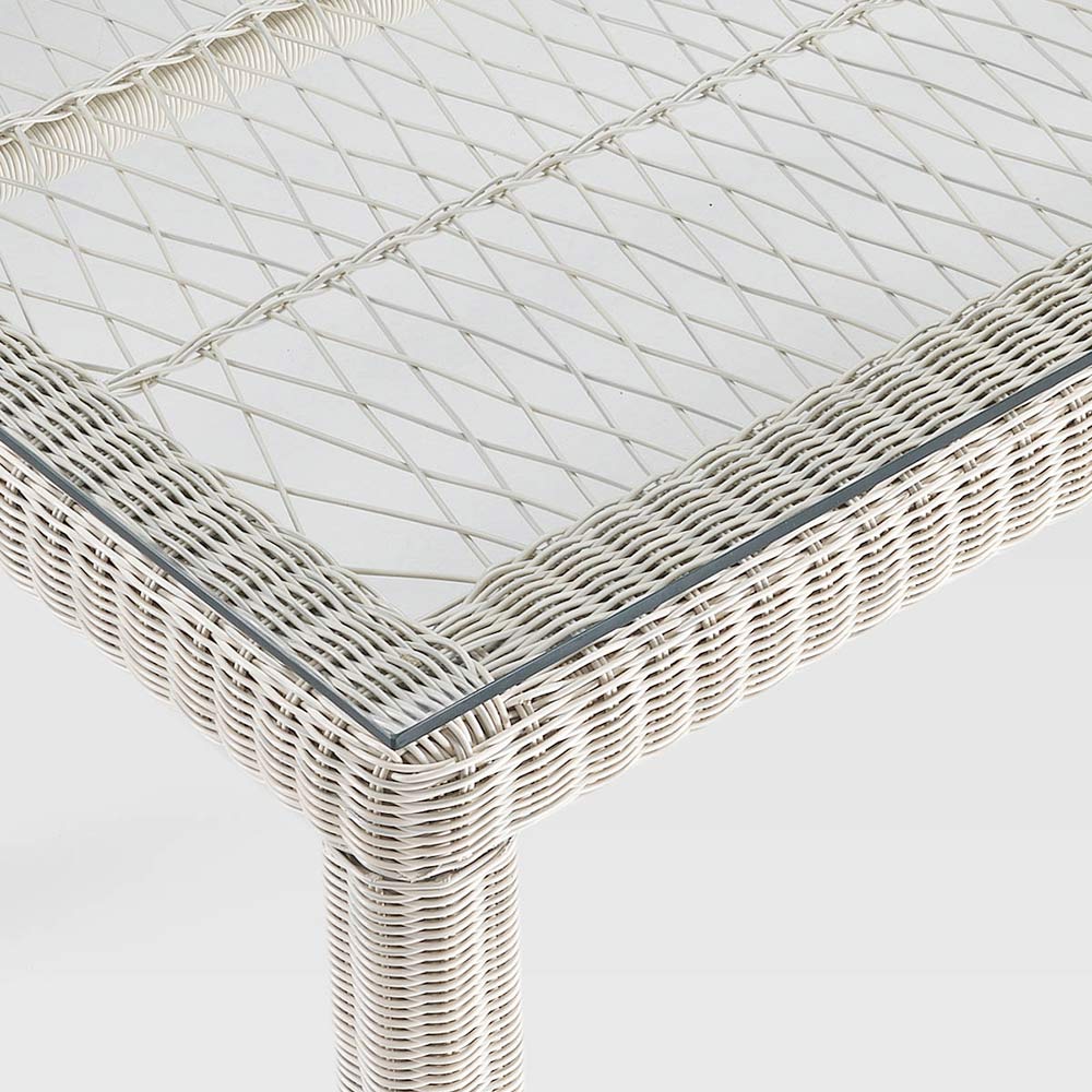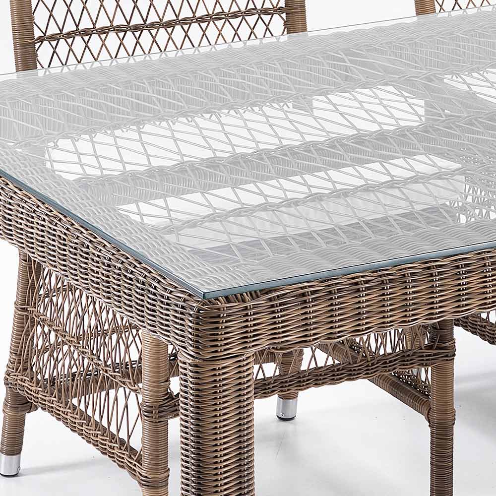 De rechthoekige buiteneettafel Gigi heeft een structuur met een frame gemaakt van gepoedercoat aluminium , waarop de hoge kwaliteit Rehau merk Polyrattan vezel met een dikte van 3 mm is handgeweven . Daarnaast is de tafel uitgerust met een 8 mm dik glazen blad , waardoor het handgeweven rozet goed tot zijn recht komt.