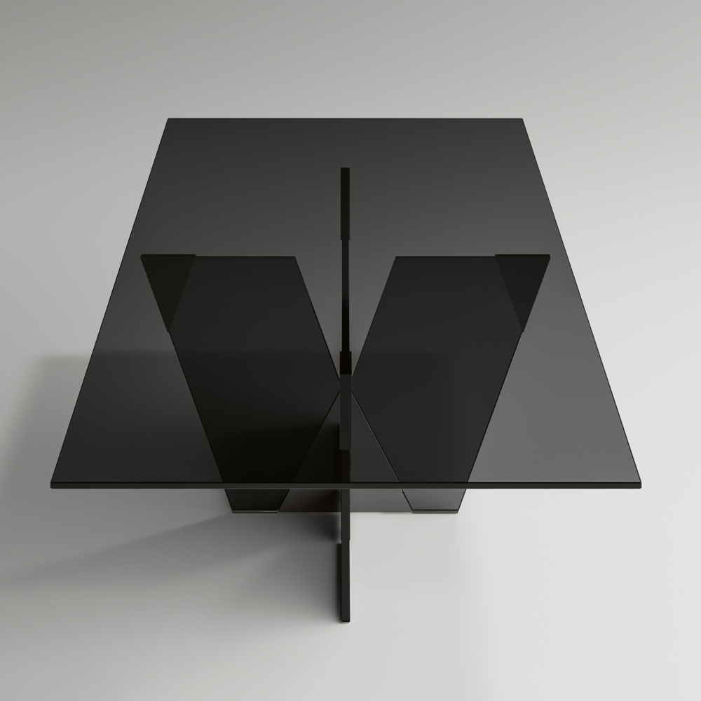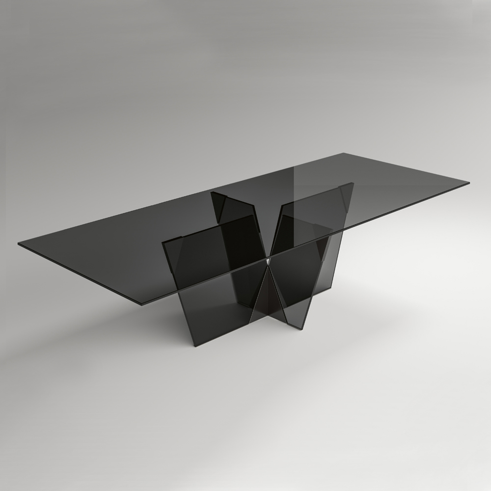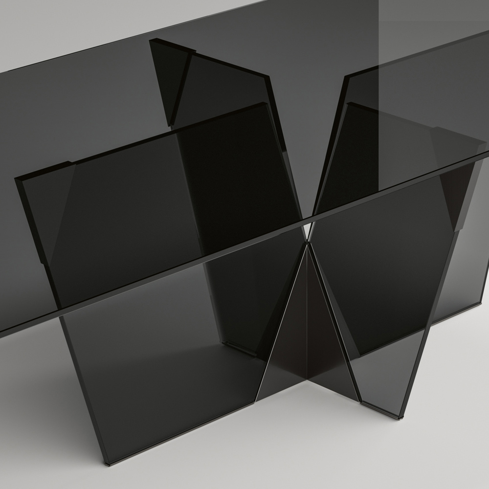 elegante en sculpturale structuur , is dit meubel geboren uit de combinatie van materialen van verschillende aard samen met de passie voor glasverwerking, waardoor het erin slaagt om een representatie van kracht en karakter te definiëren door middel van verschillende vormen en diktes. Het sterke punt van zijn esthetiek is de architecturale basis die wordt gekenmerkt door een piramidevormige verbinding van metaal die het essentiële onderdeel van het product vormt. De metalen elementen vervolledigen het ontwerp van de tafel, geven vorm aan het glas van het onderstel en verrijken het met persoonlijkheid en originaliteit.