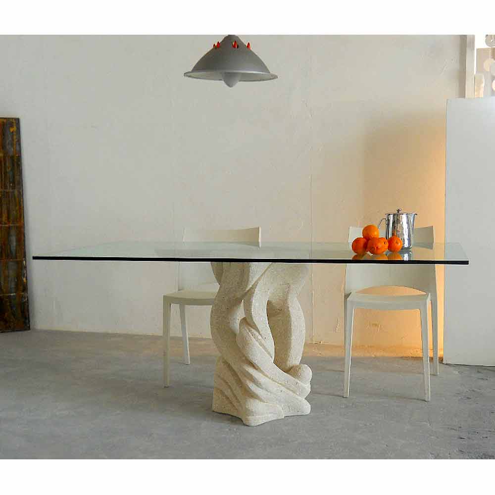 Moderne rechthoekige eettafel Gemaakt in Italië met centrale basis in natuurlijke Vicenza-steen , met de hand gesneden door het massieve blok en met een 15 mm dikke floatglas top, ondersteund door een geborstelde en gelakte staaf van onbewerkt metaal.