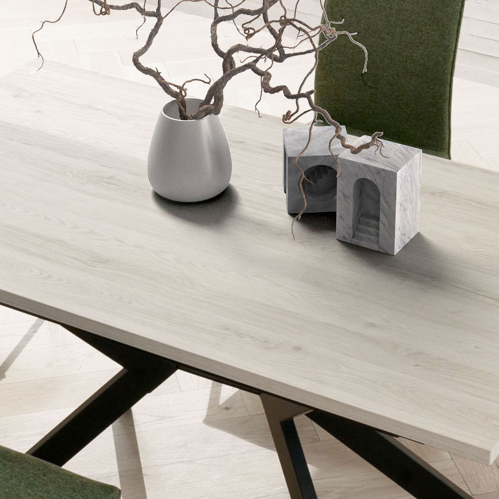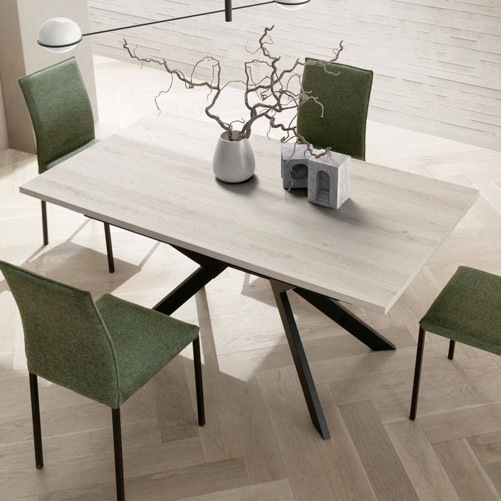 De voet, van geverfd metaal en met een gekruist geometrisch ontwerp, biedt stabiliteit en een sculpturale touch die niet onopgemerkt blijft. Een perfecte meubeloplossing voor eetkamers, open ruimtes of zakelijke omgevingen met een verfijnde stijl.