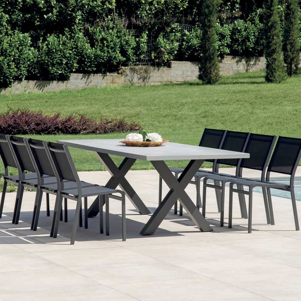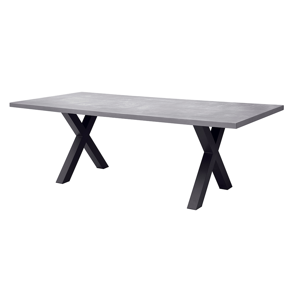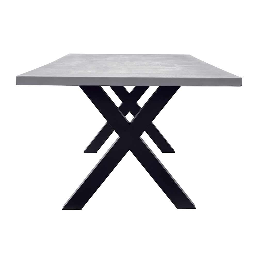 Het grijze harsblad combineert elegantie en functionaliteit en zorgt voor een duurzaam, gemakkelijk schoon te maken oppervlak dat geschikt is voor alle weersomstandigheden. De gekruiste aluminium poten geven de constructie een dynamische, eigentijdse uitstraling en zorgen tegelijkertijd voor stabiliteit en stevigheid.