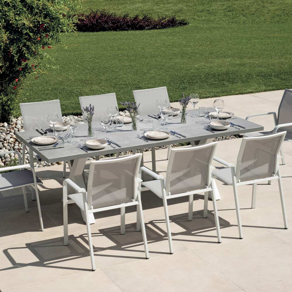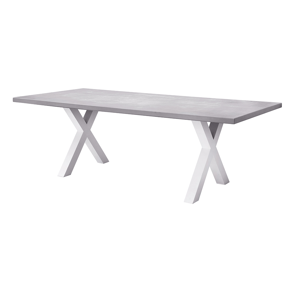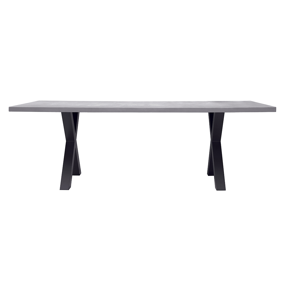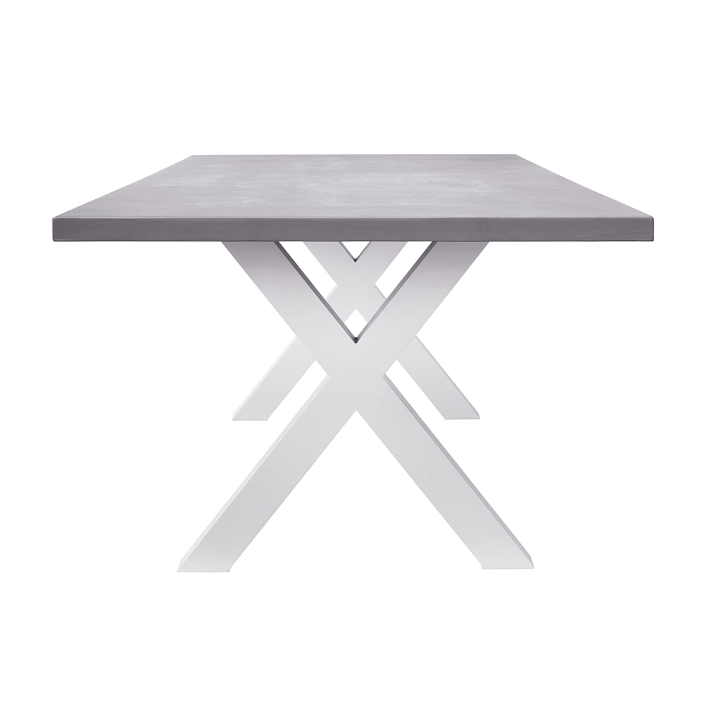 Het grijze harsblad combineert elegantie en functionaliteit en zorgt voor een duurzaam, gemakkelijk schoon te maken oppervlak dat geschikt is voor alle weersomstandigheden. De gekruiste aluminium poten geven de constructie een dynamische, eigentijdse uitstraling en zorgen tegelijkertijd voor stabiliteit en stevigheid.