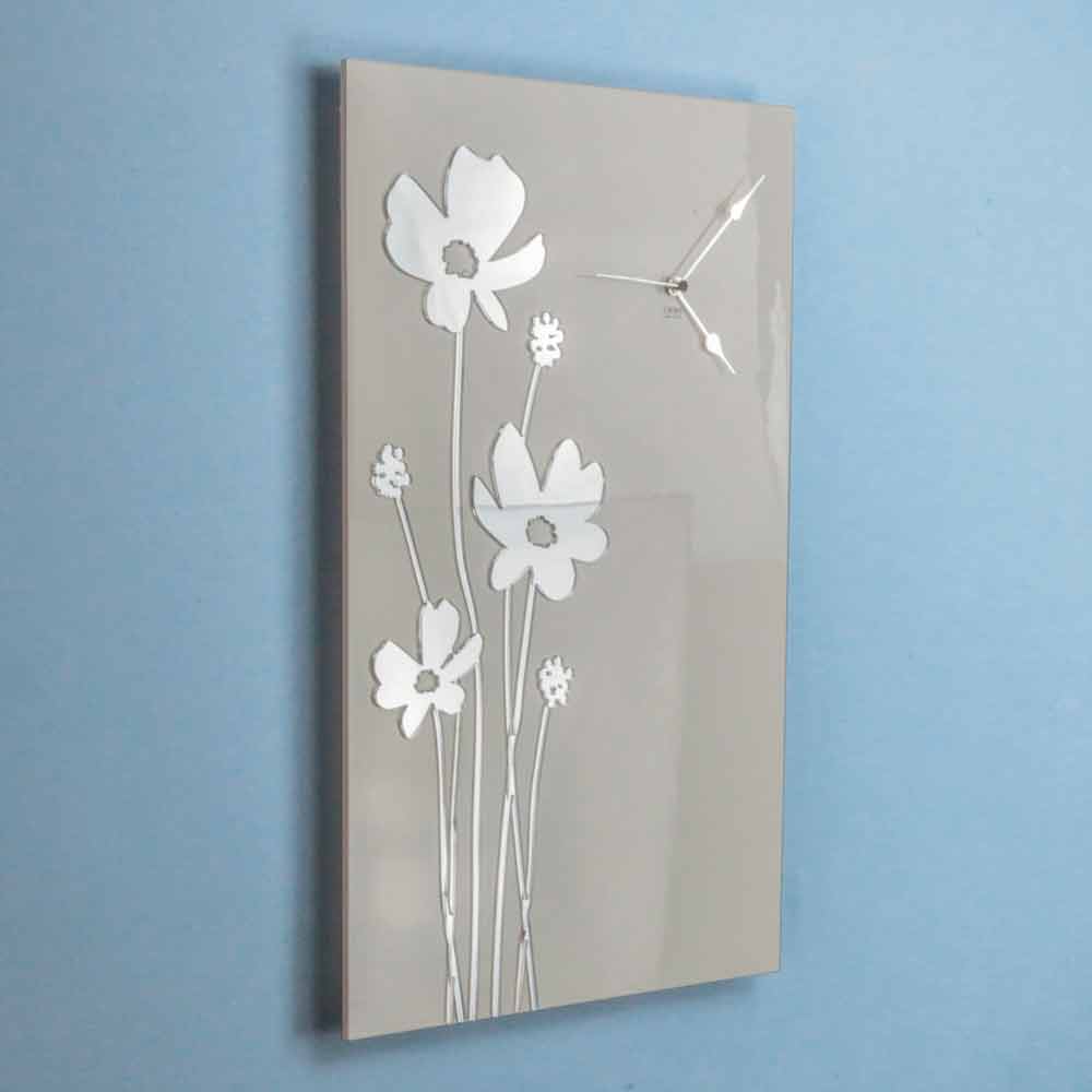 Rechthoekige wandklok van modern design in wit hout met ingelegde plexiglazen spiegels, gemaakt in Italië.