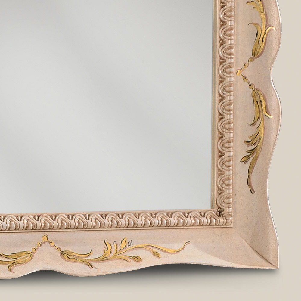 Rechthoekige spiegel in klassieke stijl met versierd frame van wit hout , perfect om uw woonkamer elegant en persoonlijk te decoreren.