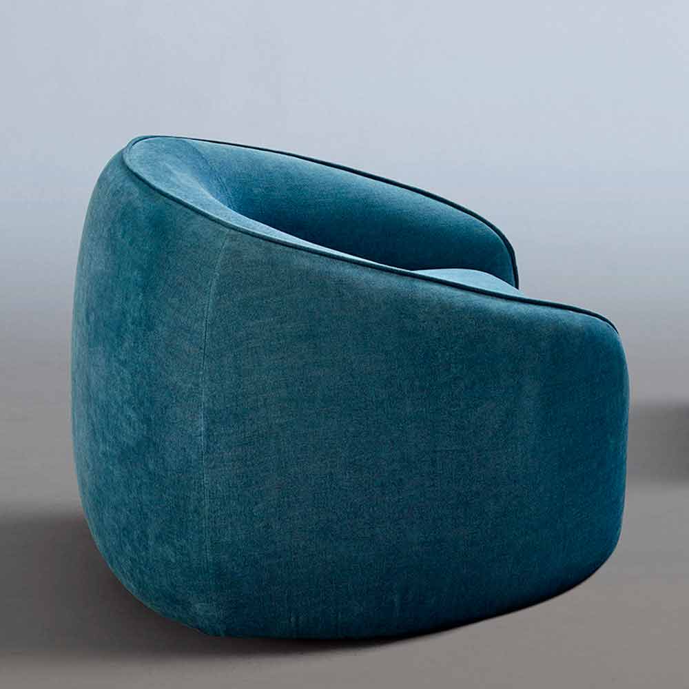 Moderne relaxfauteuil in oranje of luchtmachtblauw, luxe design met ronde vormen made in Italy.