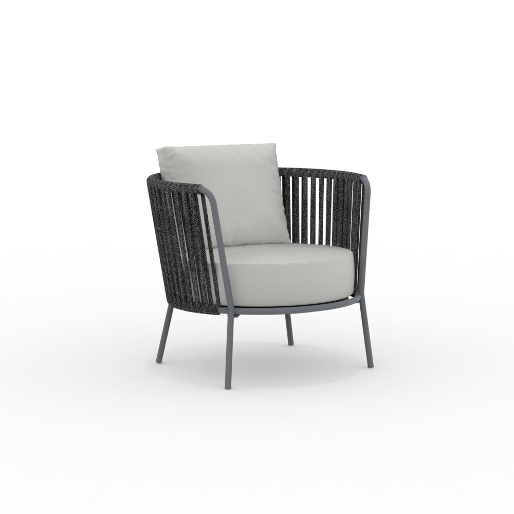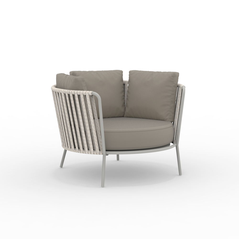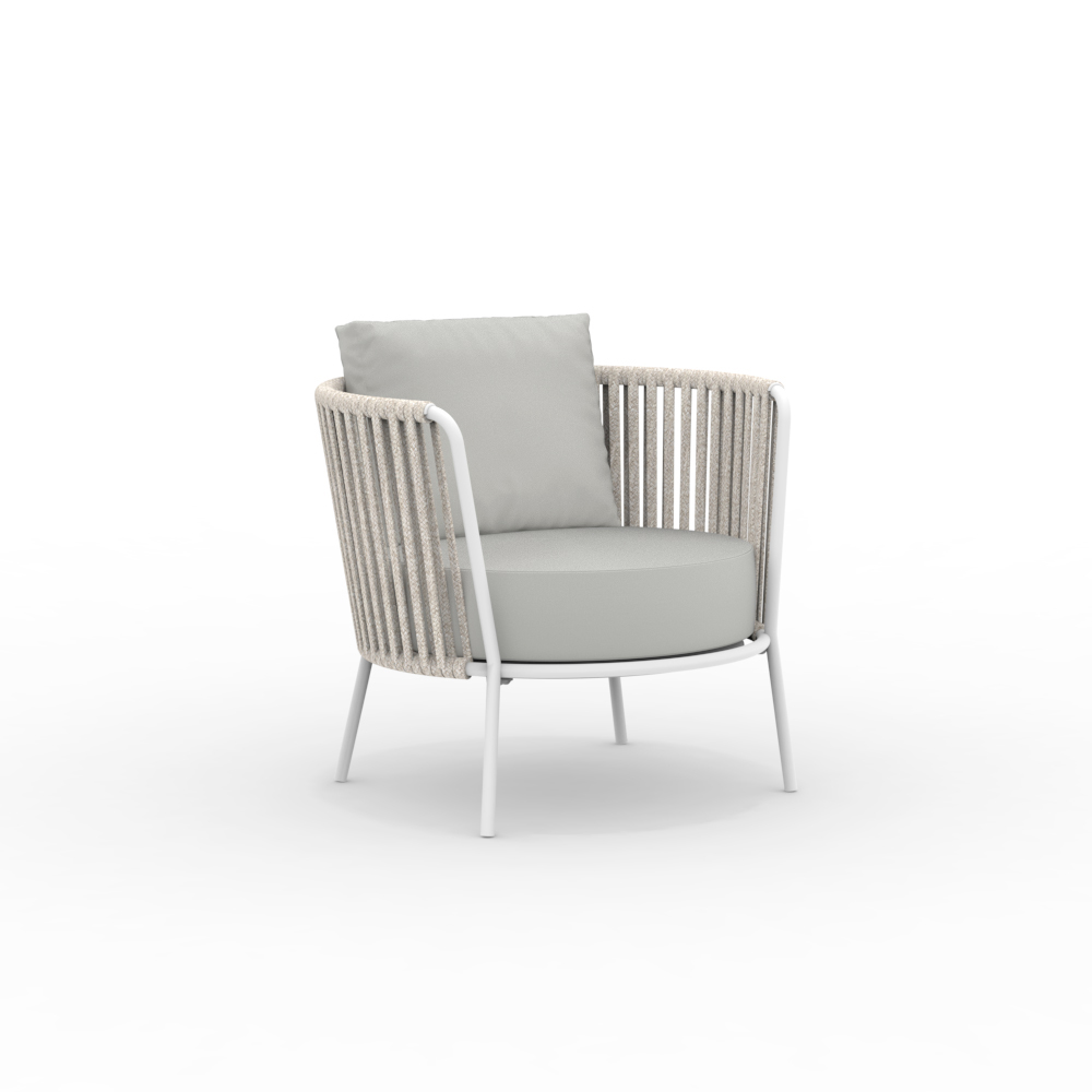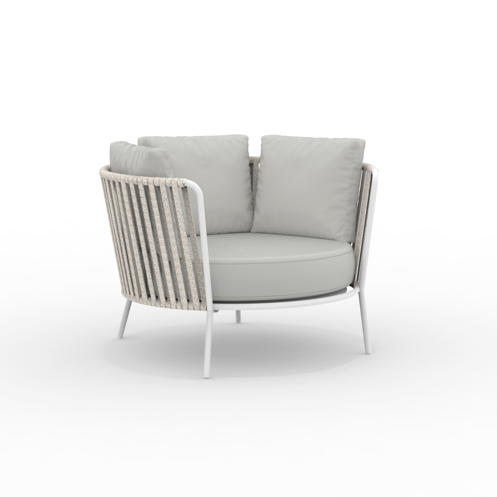 De roestvrijstalen structuur garandeert stevigheid en weerstand tegen weersinvloeden, terwijl het touwvlechtwerk een vleugje lichtheid en verfijning geeft en de zitting omhult met een comfortabele omhelzing. Het ergonomische ontwerp en de ronde lijnen zorgen voor een aangename en ontspannende zitervaring.