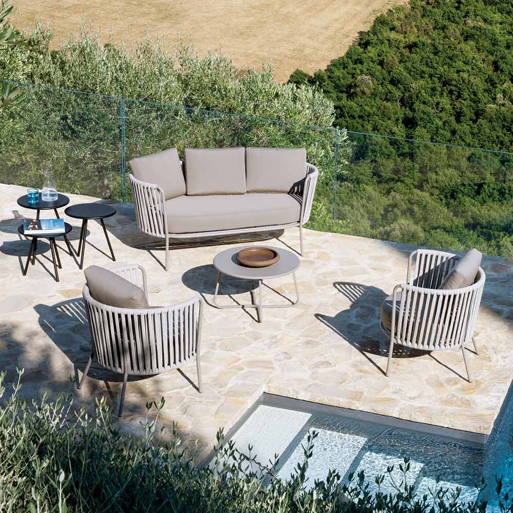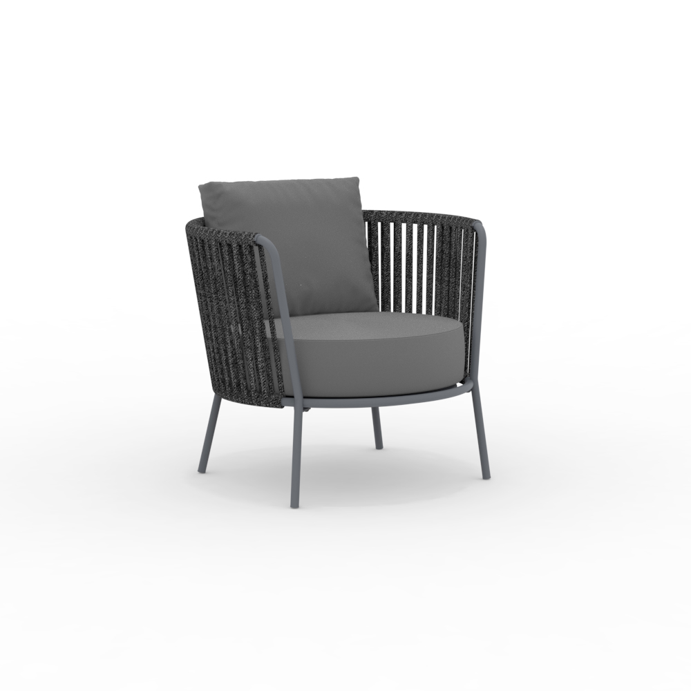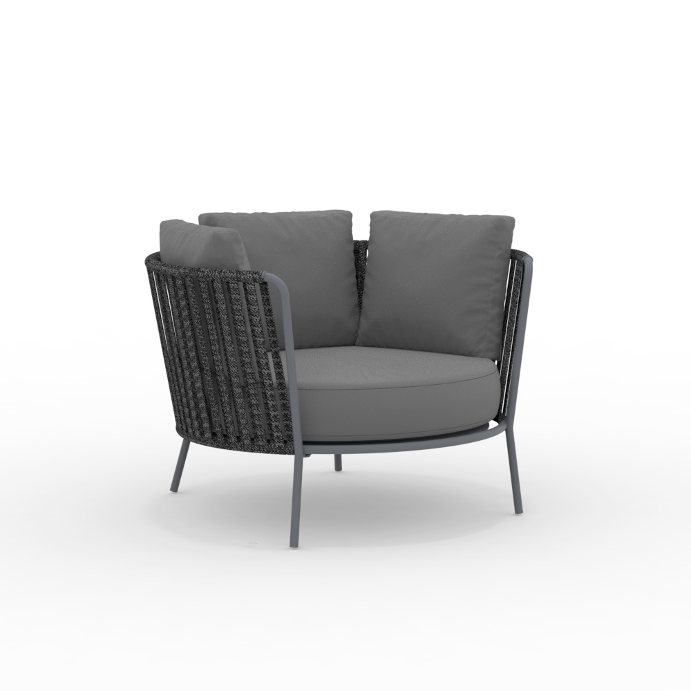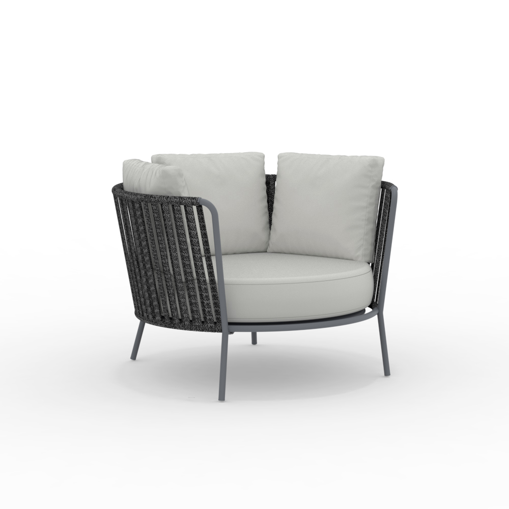 De roestvrijstalen structuur garandeert stevigheid en weerstand tegen weersinvloeden, terwijl het touwvlechtwerk een vleugje lichtheid en verfijning geeft en de zitting omhult met een comfortabele omhelzing. Het ergonomische ontwerp en de ronde lijnen zorgen voor een aangename en ontspannende zitervaring.