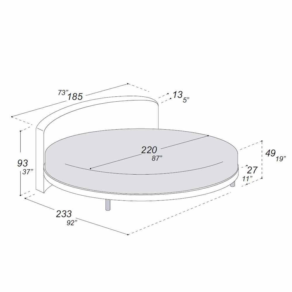 Rond tweepersoonsbed met een uniek en verfijnd design, gekenmerkt door een ongebruikelijke vorm en een afgerond hoofdeinde, waardoor het bed in het midden van de kamer kan worden geplaatst, maar ook tegen de muur.