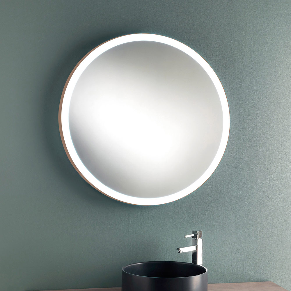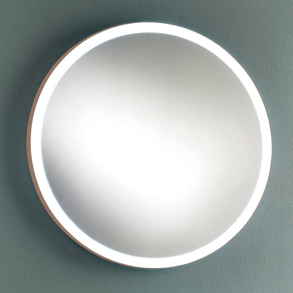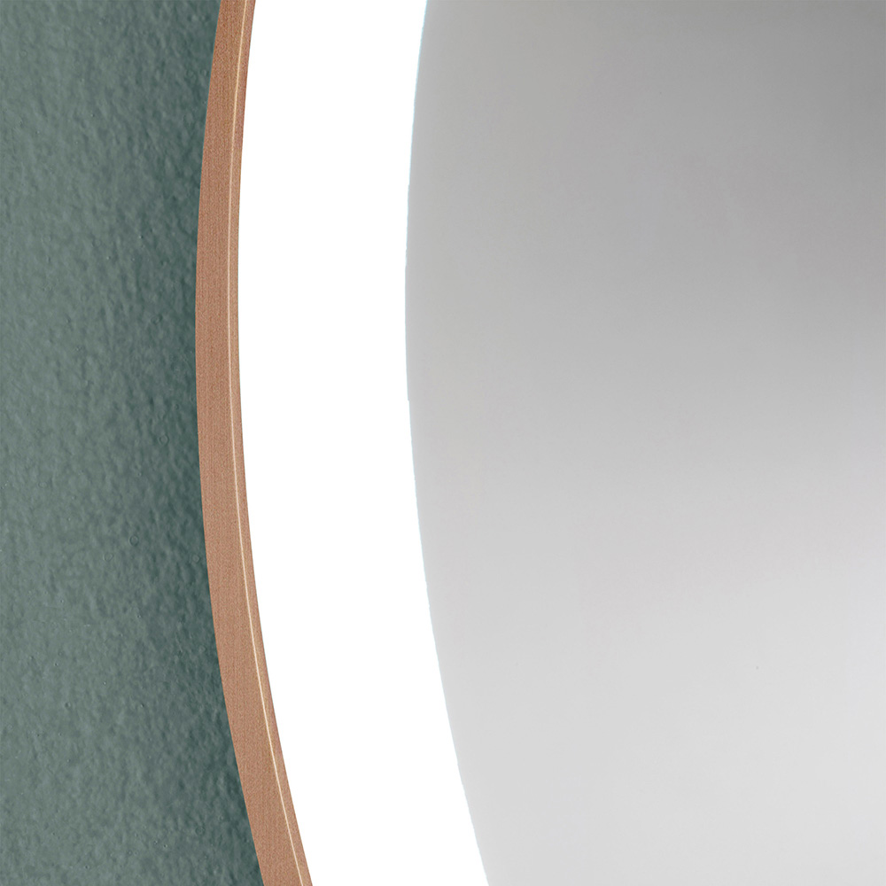 Ronde wandspiegel met koperen metalen frame en led verlichting, made in Italy.