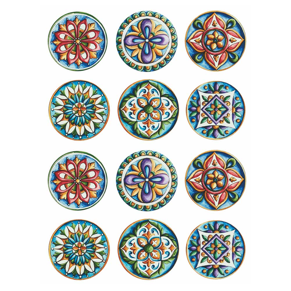Ronde kleurrijke plastic placemats met majolica dessin, 12 stuks.