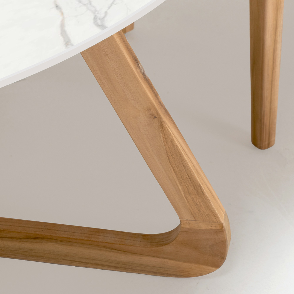 De houten voet ondersteunt niet alleen het robuuste keramische tafelblad, maar voegt ook een vleugje natuurlijke warmte toe, wat een betoverend visueel contrast creëert met het glanzende marmeren blad. Deze combinatie is niet alleen esthetisch aantrekkelijk , maar biedt ook duurzaamheid en weerbestendigheid , waardoor de tafel ideaal is voor dagelijks buitengebruik.