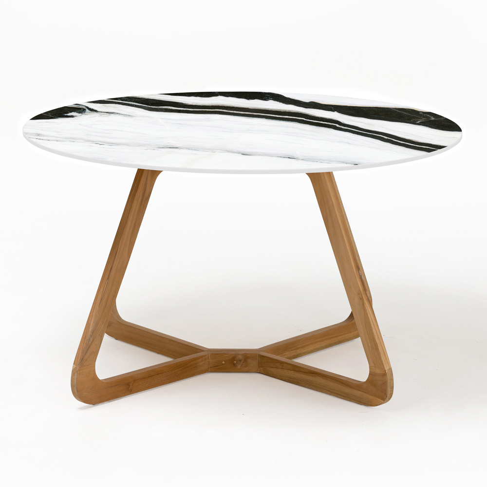 De houten voet ondersteunt niet alleen het blad stevig, maar voegt ook een element van warmte en natuurlijkheid toe, waardoor een perfecte balans ontstaat met het opvallende contrast van het keramische blad. Dit ontwerp is niet alleen esthetisch verfijnd , maar ook functioneel , ideaal om de weersomstandigheden te weerstaan dankzij de hoogwaardige materialen.
