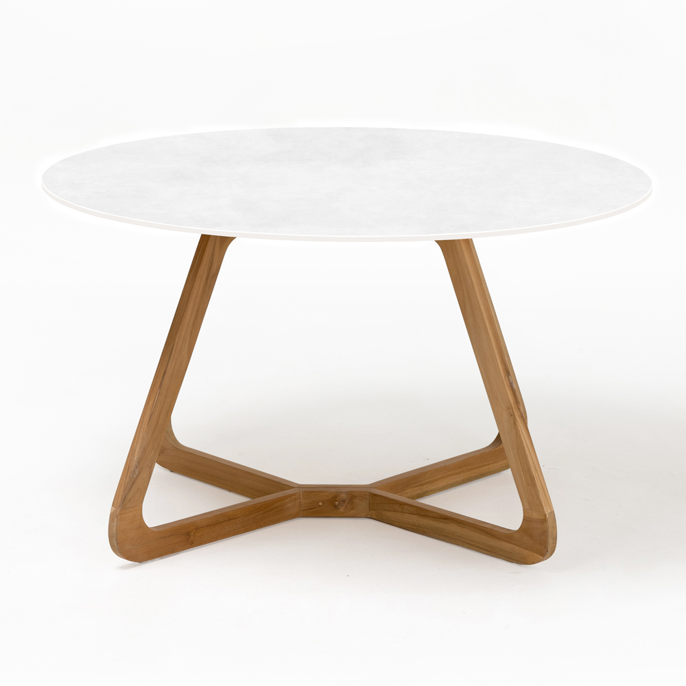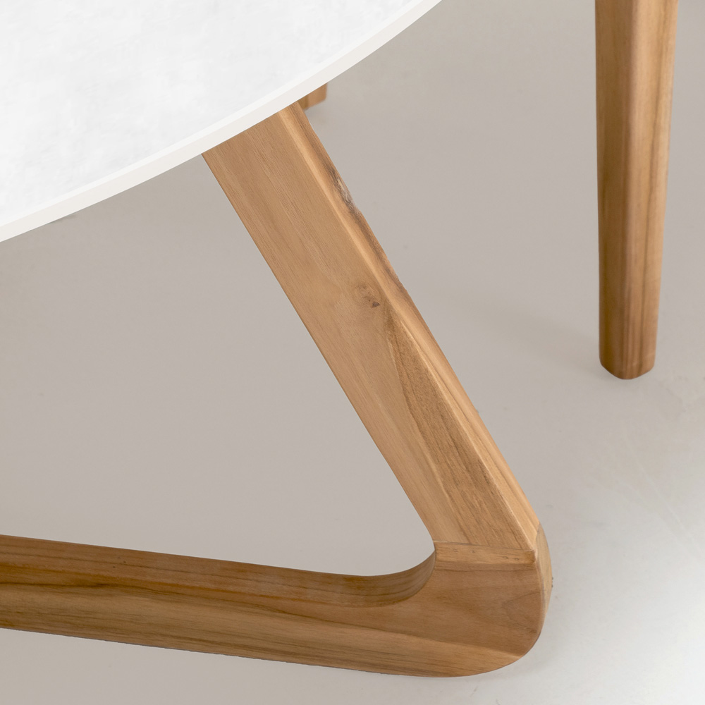 Het houten onderstel zorgt voor een warm en textuurrijk contrast en combineert de frisheid van het keramische blad met de rijkdom en stevigheid ervan. Deze materiaalcombinatie is niet alleen esthetisch aantrekkelijk, maar biedt ook uitzonderlijke duurzaamheid en weerstand tegen de elementen, waardoor de tafel ideaal is voor dagelijks buitengebruik.