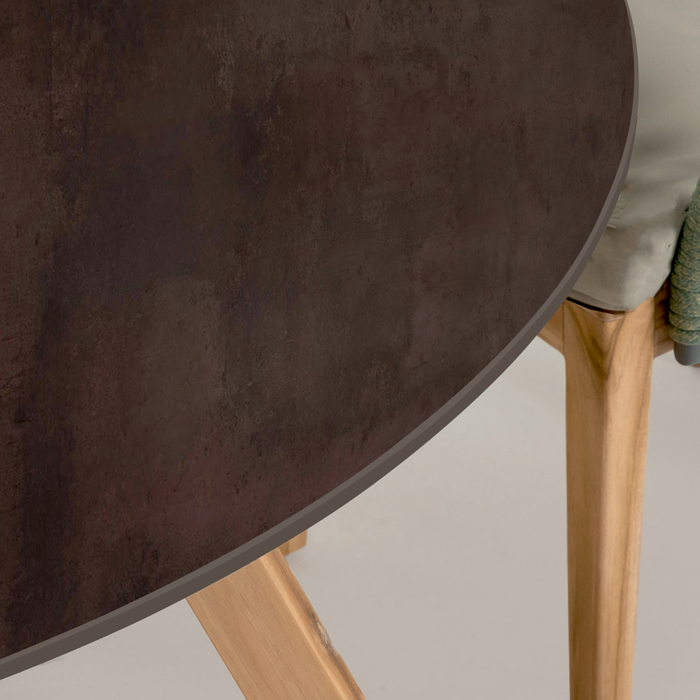 De houten voet biedt niet alleen stevige ondersteuning, maar voegt ook een vleugje warmte toe, wat een effectief contrast vormt met de roestige tint van het keramische blad. Deze combinatie is niet alleen esthetisch aantrekkelijk, maar zorgt ook voor duurzaamheid en stabiliteit , perfect om de weersomstandigheden te weerstaan.