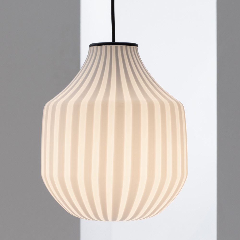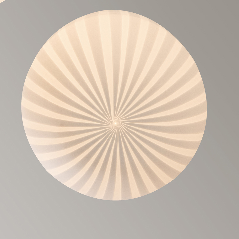De lamp is gemaakt met een witte filigrane glazen diffuser door vakmanschap , een materiaal dat glans en moderniteit geeft aan het licht, dat er doorheen gaat en sublieme en boeiende sferen creëert, en een verwijderbare aluminium voet.