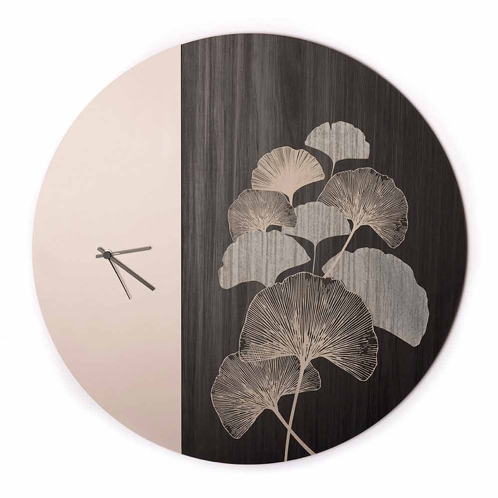 Wandklok van hout met laser-gemarkeerde decoratie, rond ontwerp in twee afwerkingen gemaakt in Italië.
