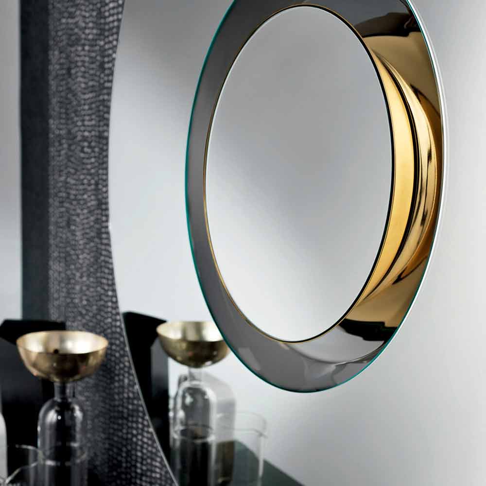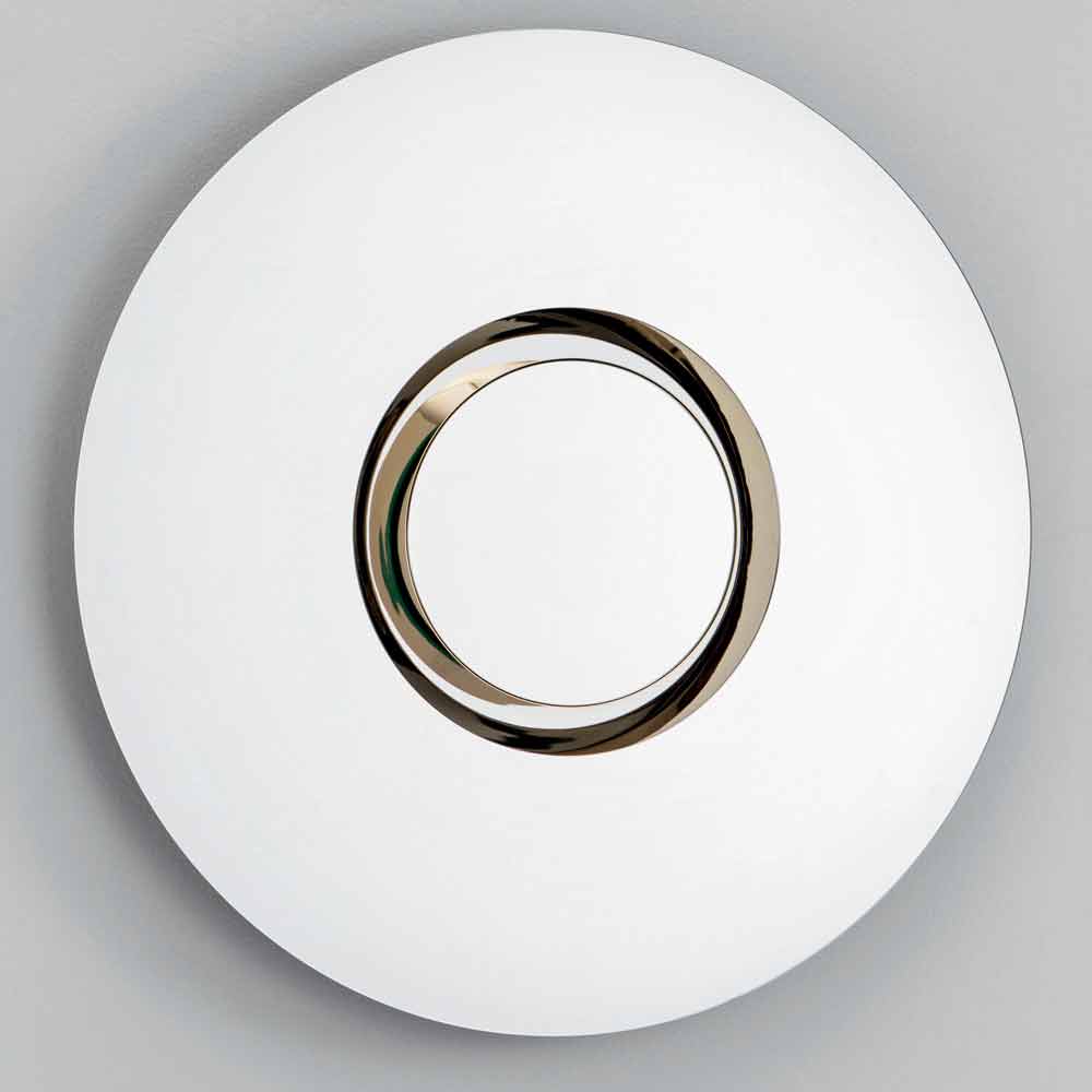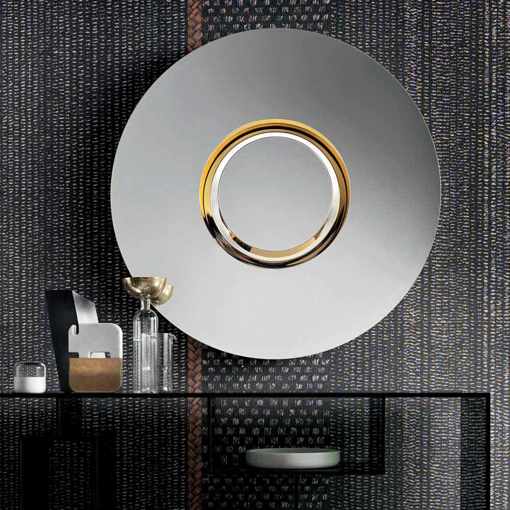 De wandspiegel heeft een rond ontwerp en wordt gekenmerkt door het verwijderbare centrale deel dat hem origineel en uniek maakt: het is in feite een cirkelvormig en concentrisch meubel met een centrale cirkel in goudkleurig metaal dat ook als middelpunt kan worden gebruikt.