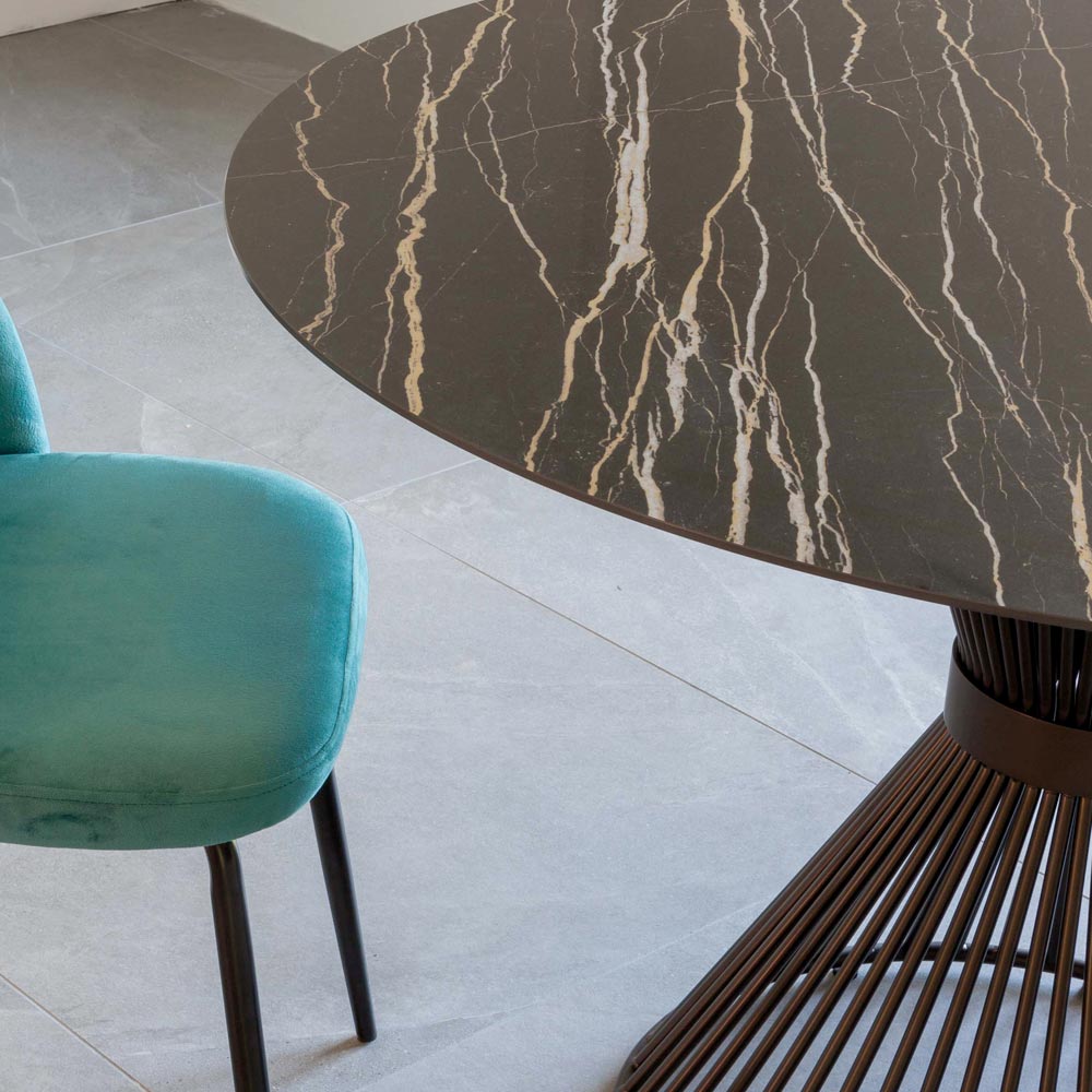 Ronde woonkamertafel gemaakt van keramiek en staal