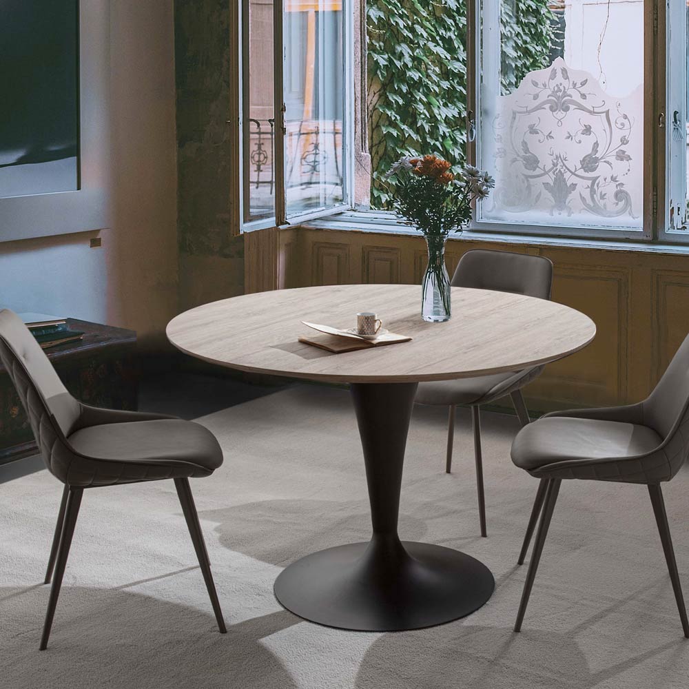 Prachtige eettafel met rond blad in geplateerd gelamineerd hout (h 30 mm), structuur eiken afwerking met uitlopende rand in mdf en voet in zwart gelakt staal . Elegantie en functionaliteit zijn de sleutelwoorden die dit moderne meubelstuk het beste omschrijven dat een uiterst eigentijdse uitstraling belichaamt en in staat is om de esthetiek van de kamer te verrijken met behoud van vrij kleine afmetingen en daarom ideaal blijkt voor diegenen die beperkte beschikbare ruimte hebben maar niet willen geven op een verfijnde en stijlvolle manier in te richten. Ideaal om elke omgeving met soberheid te completeren, deze tafel is ook buitengewoon veelzijdig , dankzij de perfecte combinatie van eenvoudige en essentiële afwerkingen.