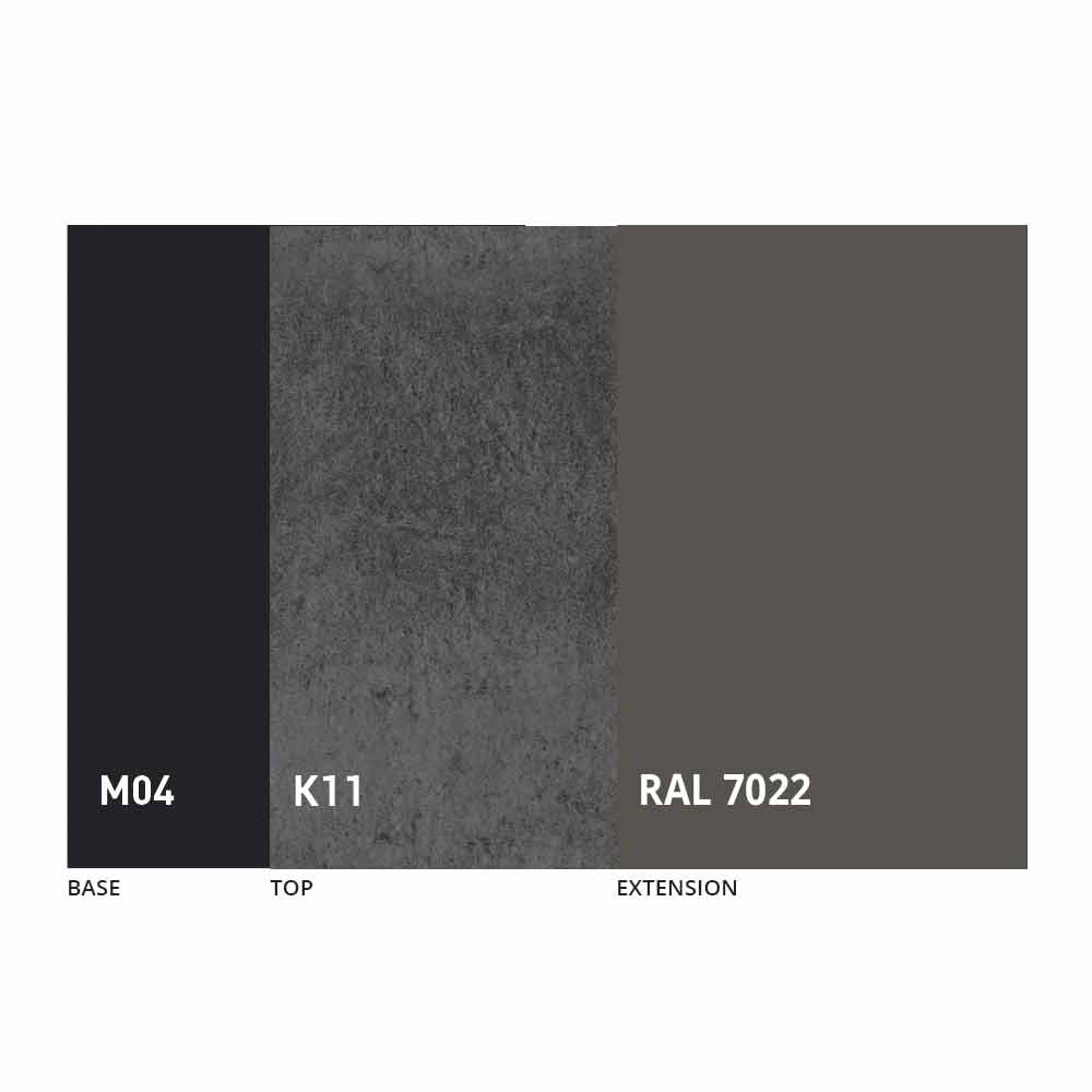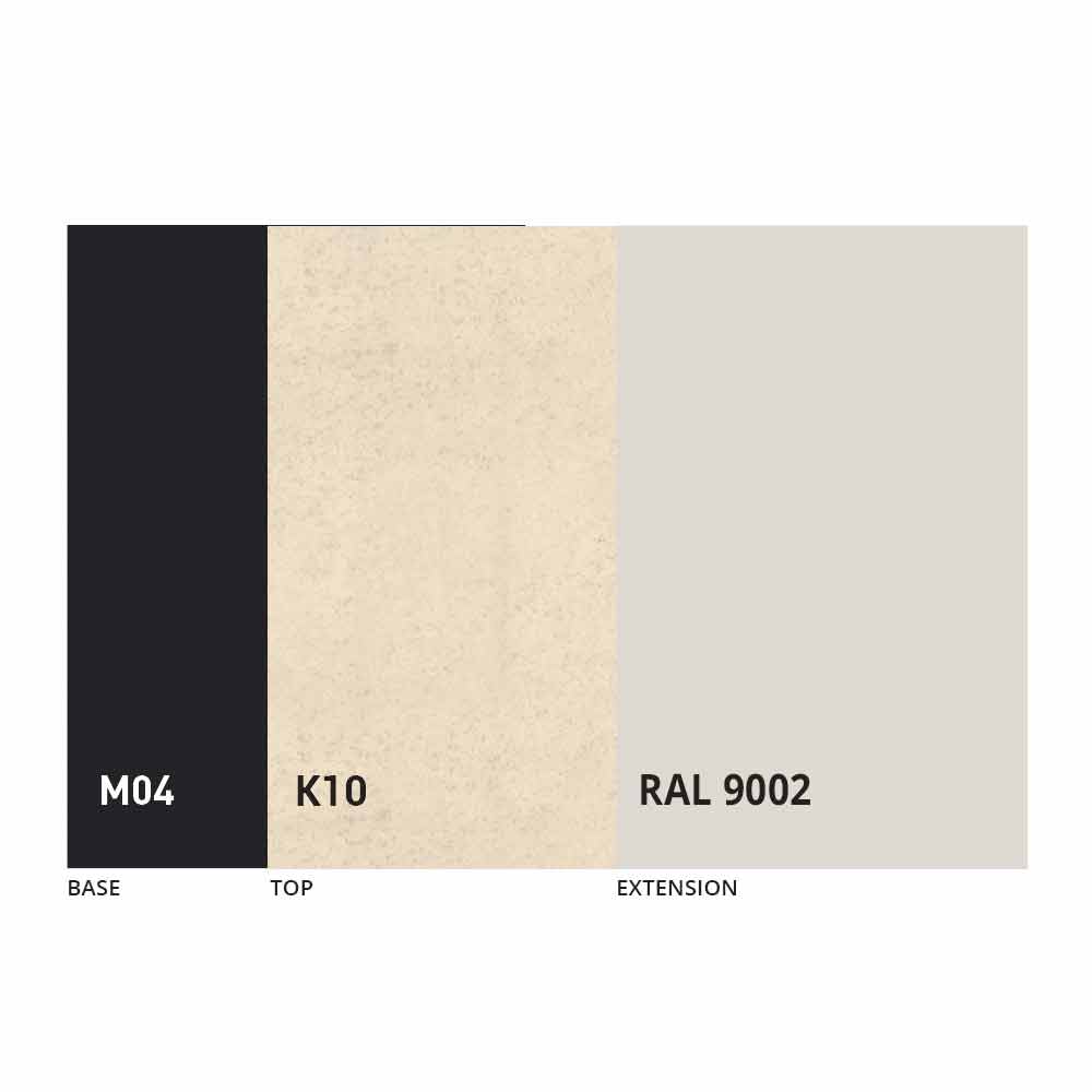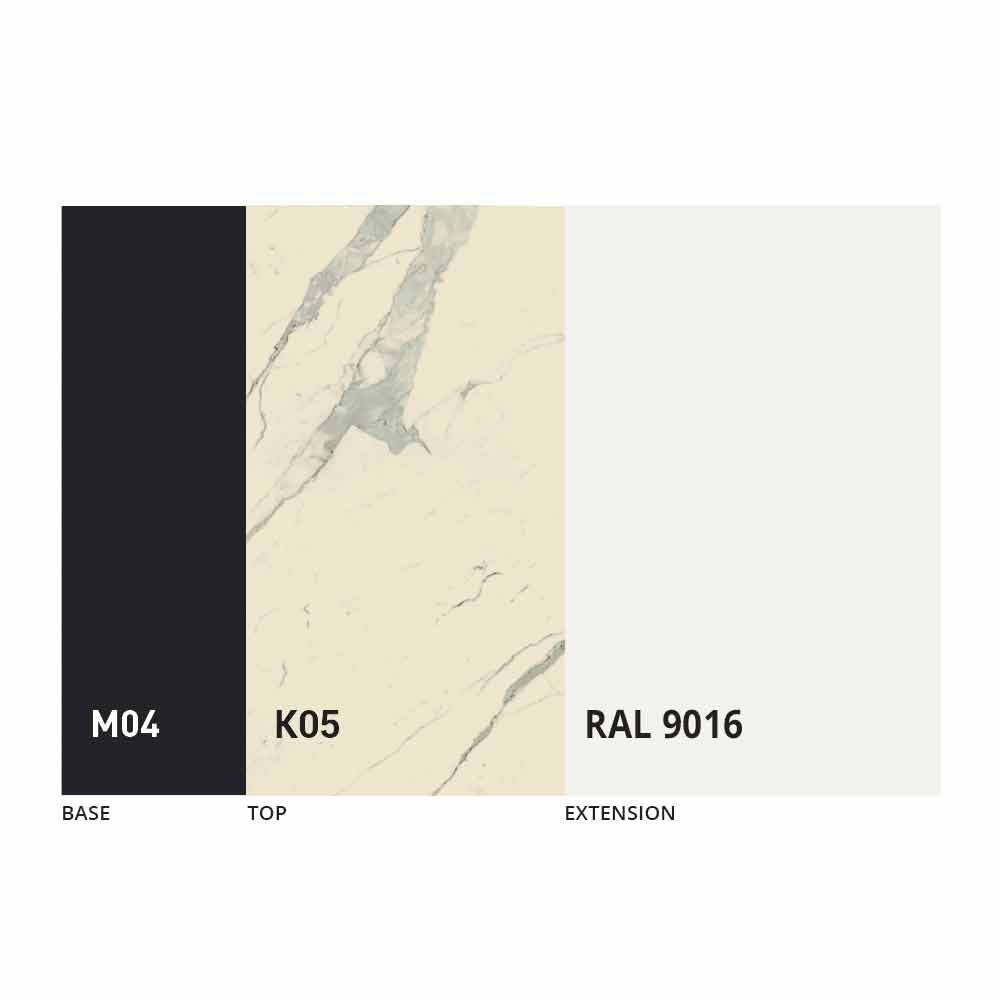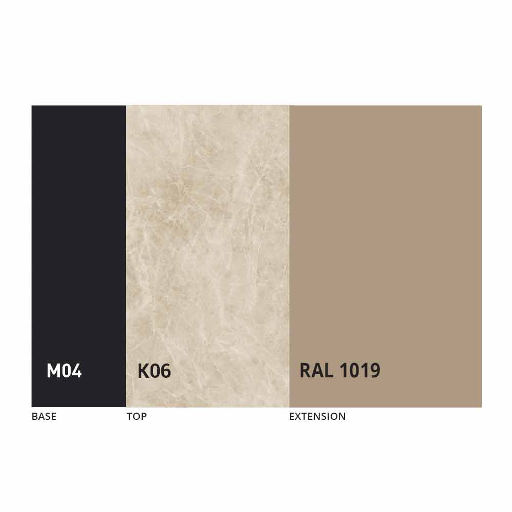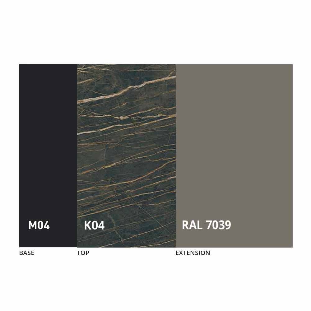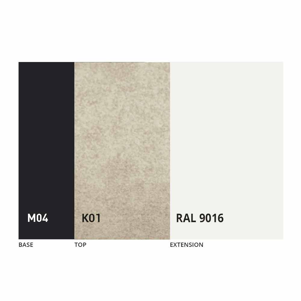 Het blad en de basis van de tafel kunnen worden aangepast met verschillende materialen en voorbeeldafwerkingen of RAL-lakken. Neem voor informatie contact met ons op via het daarvoor bestemde formulier "