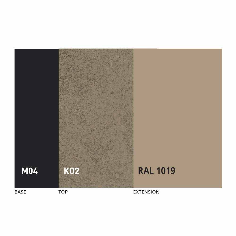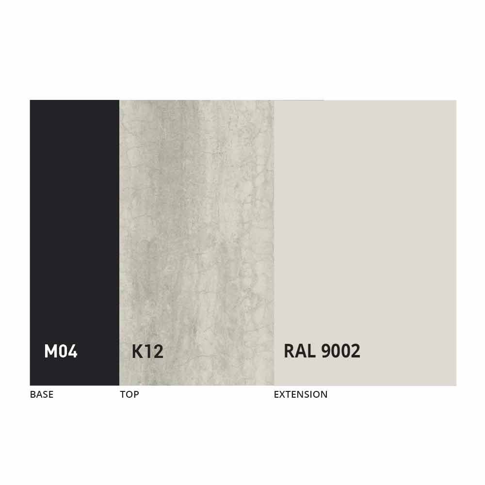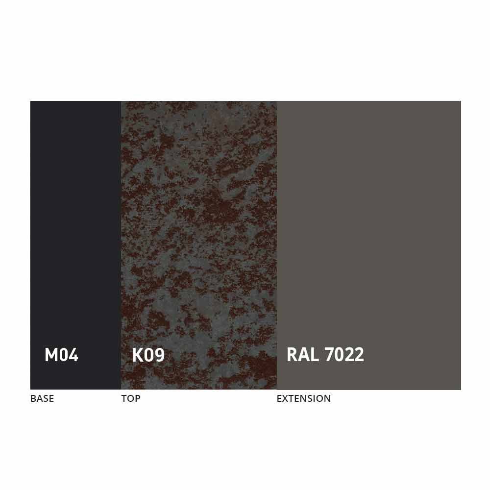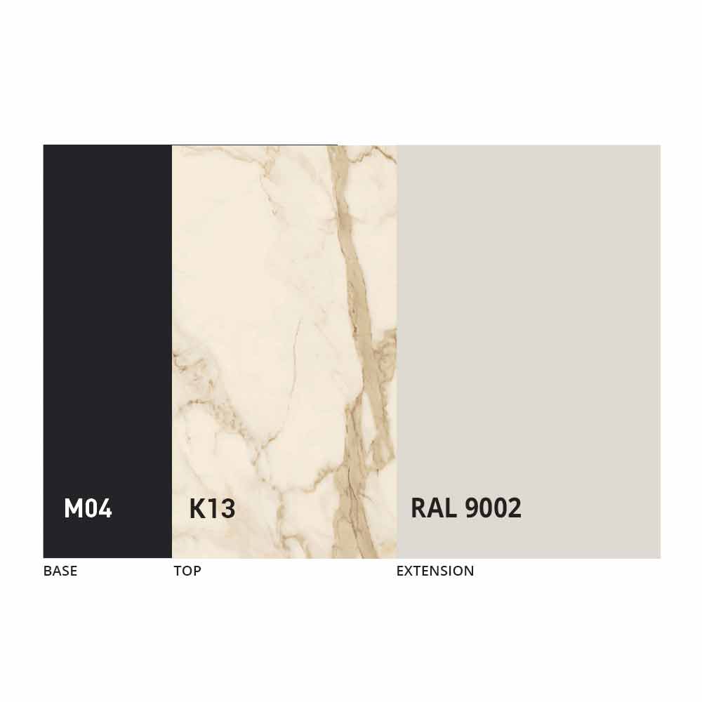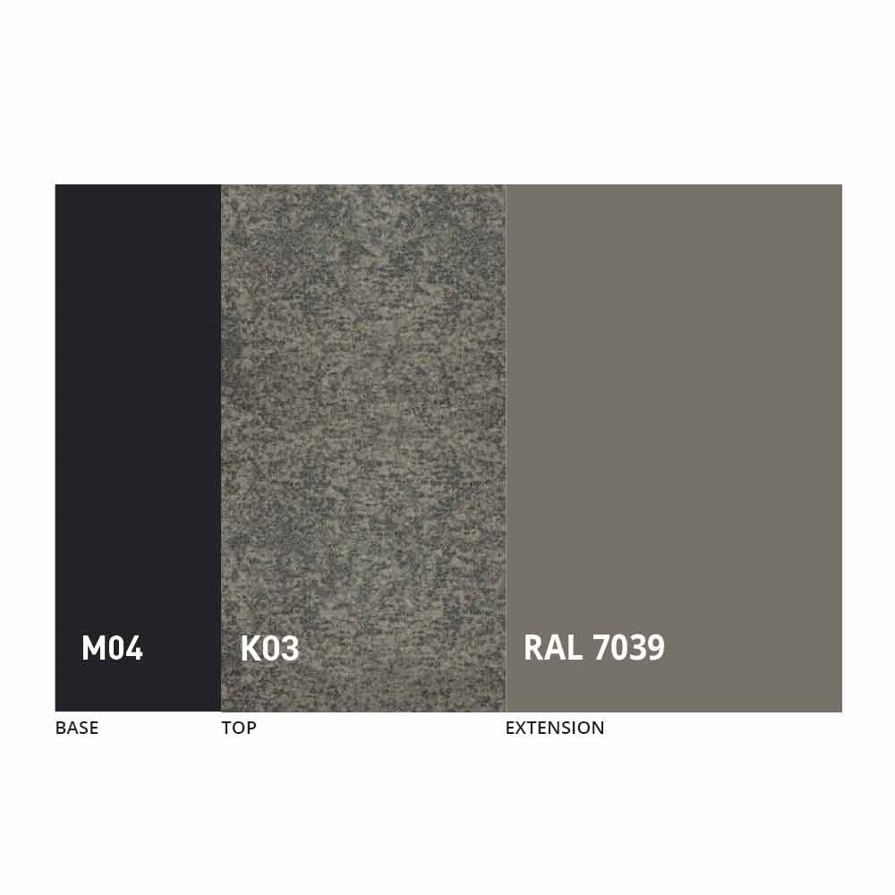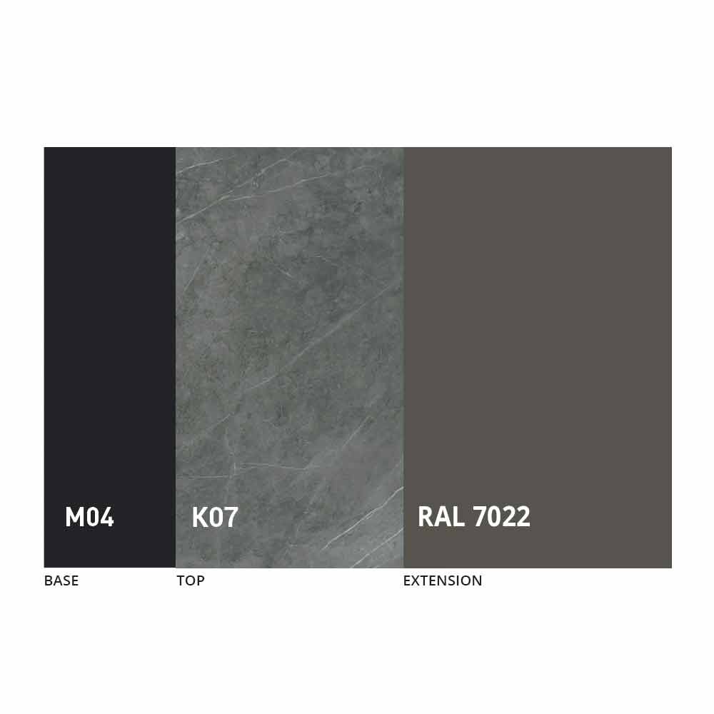 Het blad en de basis van de tafel kunnen worden aangepast met verschillende materialen en voorbeeldafwerkingen of RAL-lakken. Neem voor informatie contact met ons op via het daarvoor bestemde formulier "