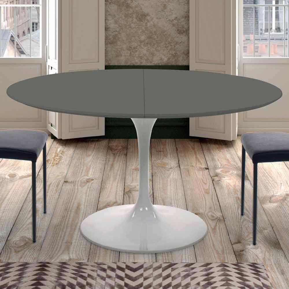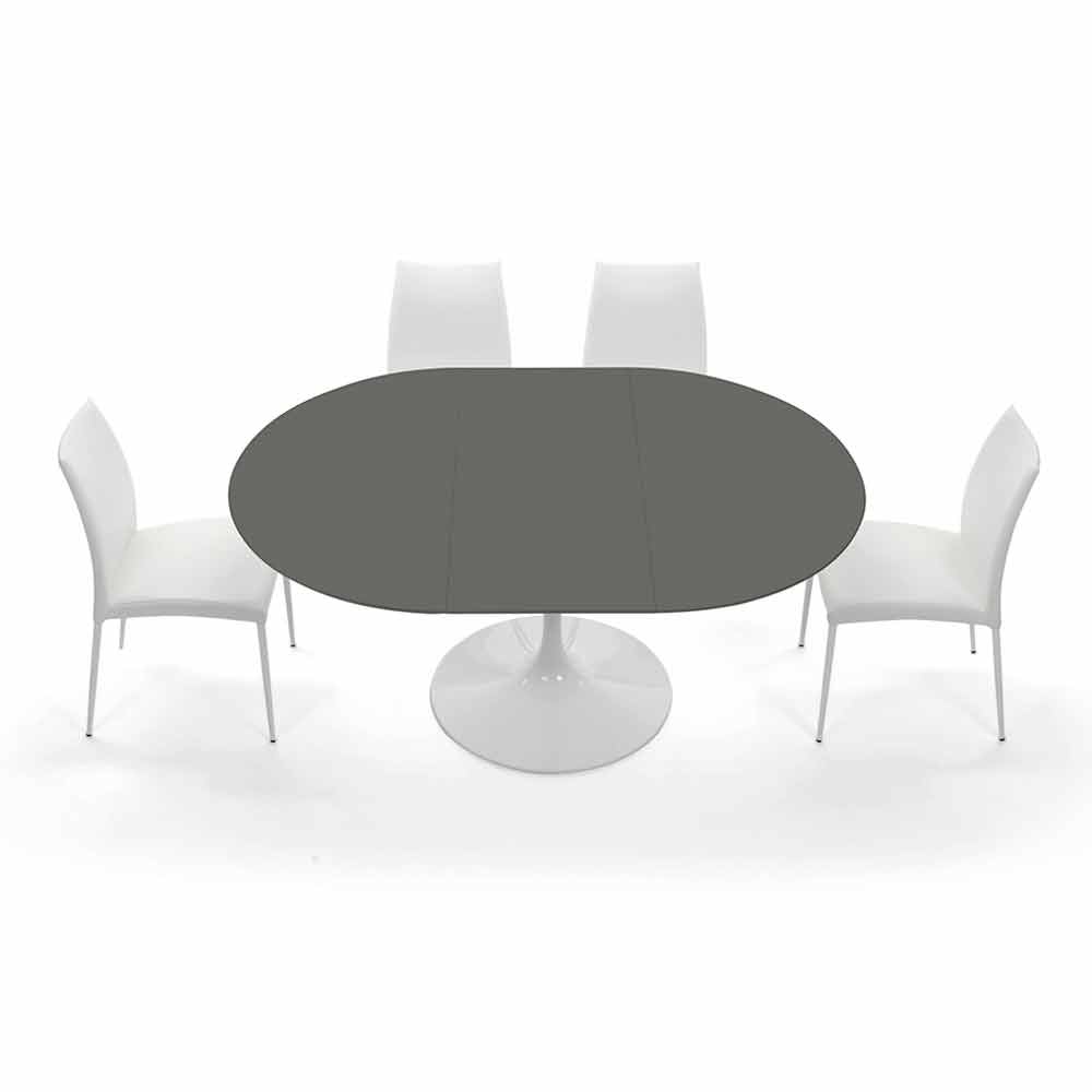 Eettafel gemaakt in Italië met rond uitschuifbaar fenix blad (dikte 20 mm) en onderstel in glanzend wit gelakt gegoten aluminium . Uit de ontmoeting tussen hoogwaardige grondstoffen en een exclusief en revolutionair ontwerp wordt een meubelaccessoire met een moderne ziel geboren dat erin slaagt de stijl van elke omgeving te voltooien en innovatie en persoonlijkheid met zich meebrengt. Wat de functionele kant ervan vergroot, is het uitschuifbare blad dat, dankzij een extern verlengstuk van 50 cm , een lengte van 170 cm kan bereiken, waardoor het plaats biedt aan maximaal 8 personen en vervolgens een kleinere ruimte in beslag neemt als het gesloten is. De esthetiek wordt in plaats daarvan gekenmerkt door het fenix-blad dat, door het gebruik van innovatieve harsen , een resistent oppervlak biedt, aangenaam aanvoelt en uiterst ondoorzichtig is , elementen die, naast het vergroten van de functionaliteit van de tafel, het ontwerp onderstrepen en vervolledigen door wat een origineel en stijlvol tintje geeft.
