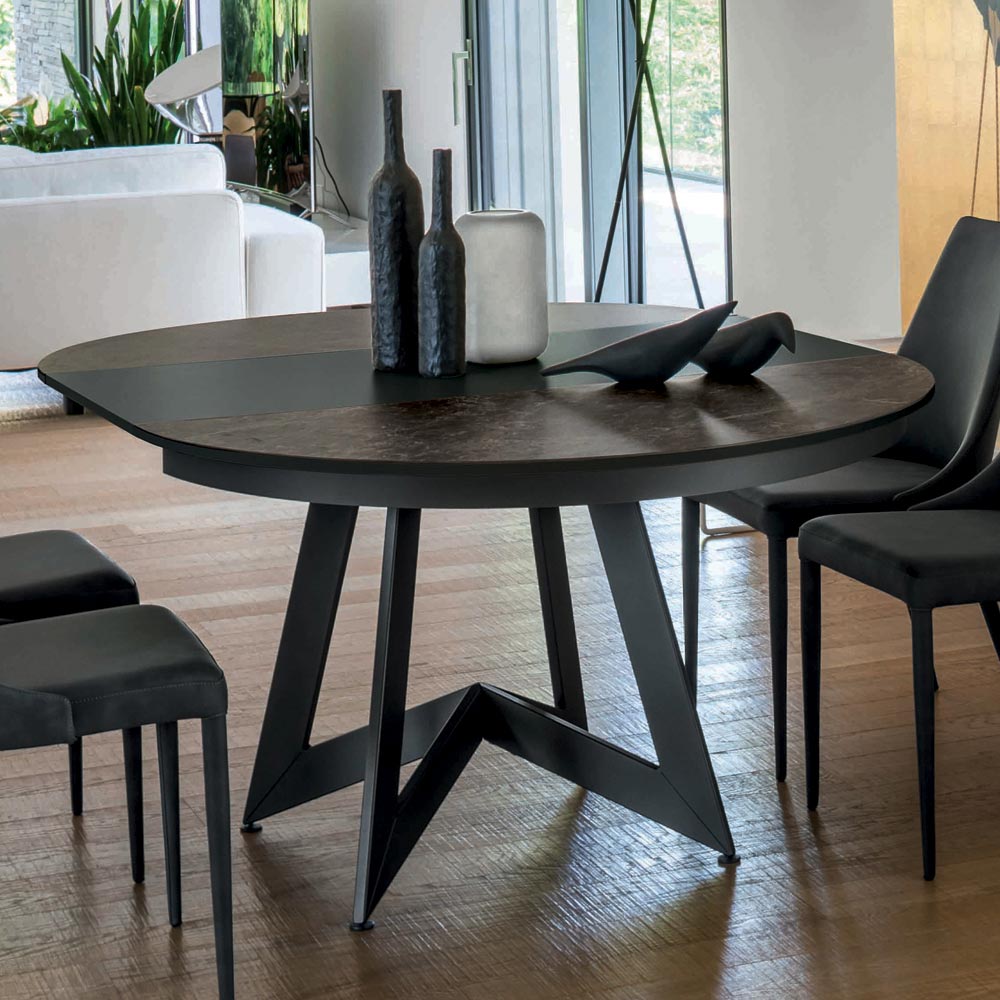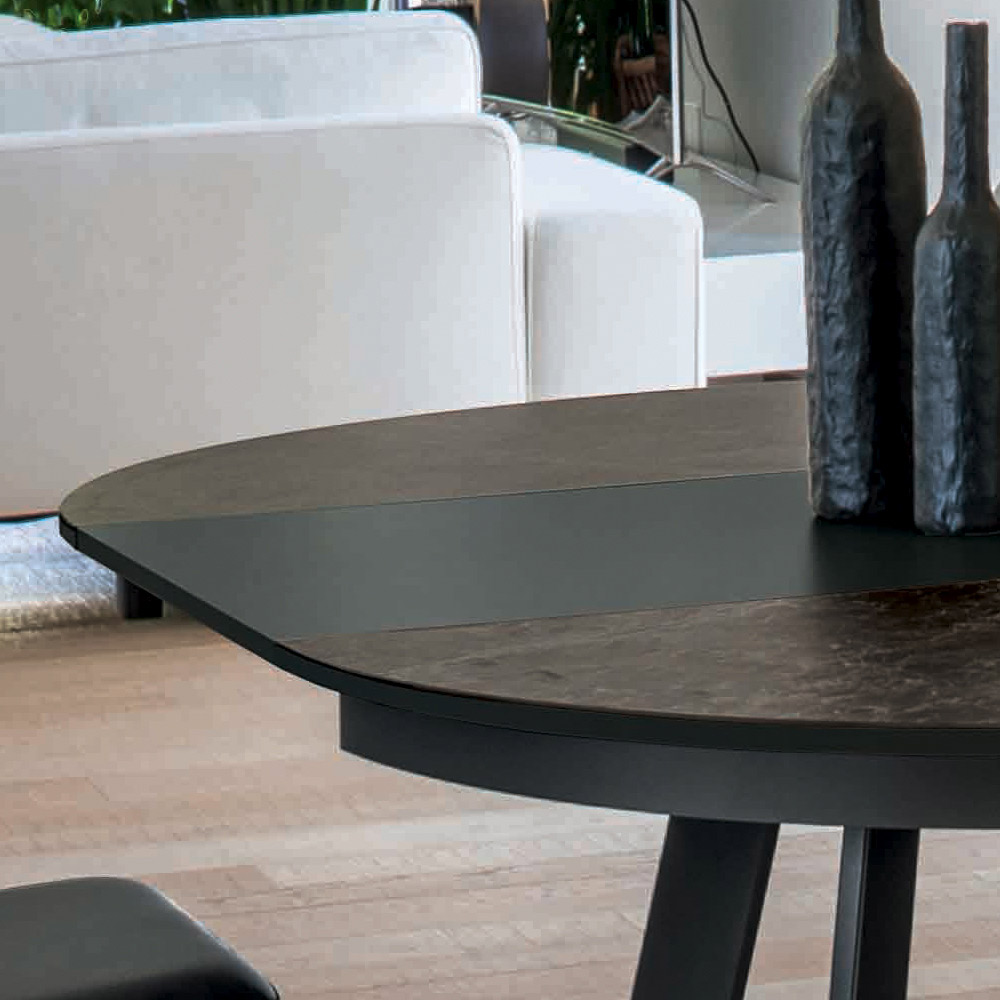 Ronde uitschuifbare eettafel van keramiek en geverfd metaal Made in Italy.