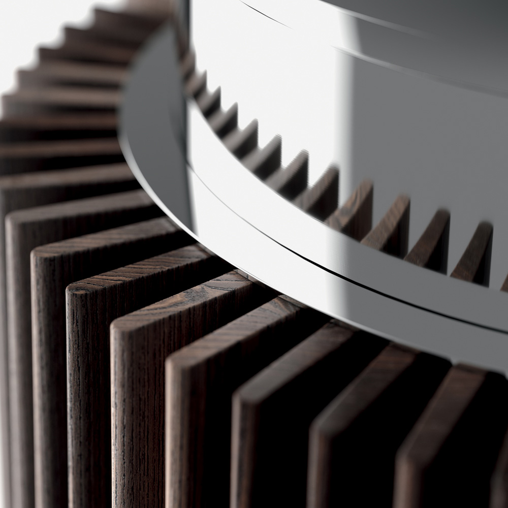 houten en metalen latten . Het sterke punt van zijn esthetiek is de architecturale basis die wordt gekenmerkt door lamellen die rusten op een
