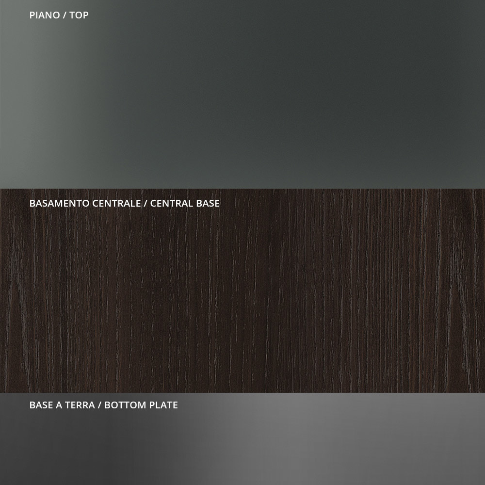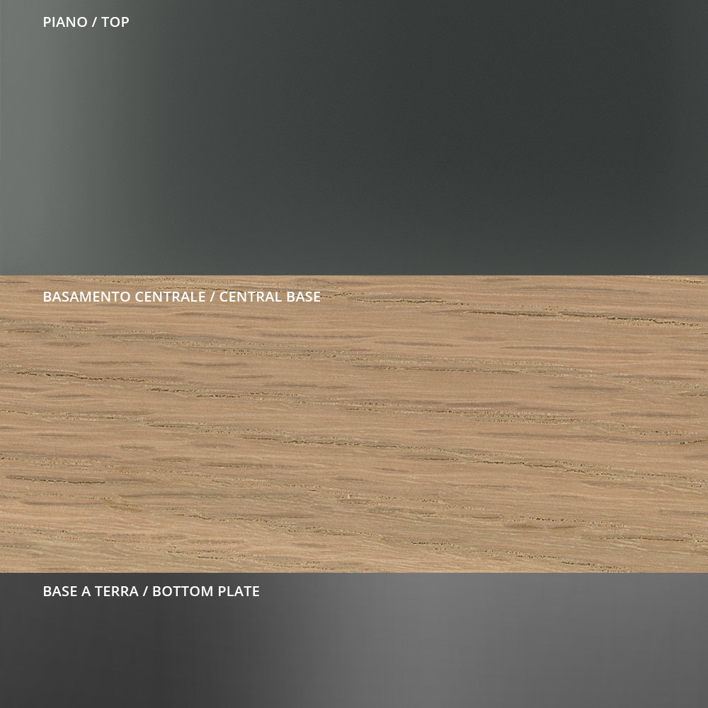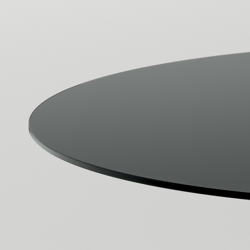 metalen basis met een glanzende gunmetal grijze afwerking. Het blad met zijn afgeronde rand geeft zachtheid aan de vormen, terwijl de metalen elementen het ontwerp van de tafel vervolledigen en het verrijken met