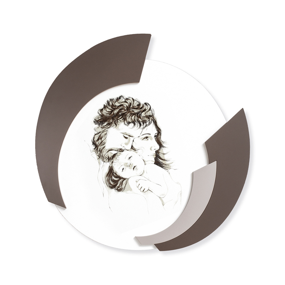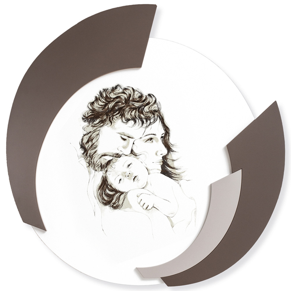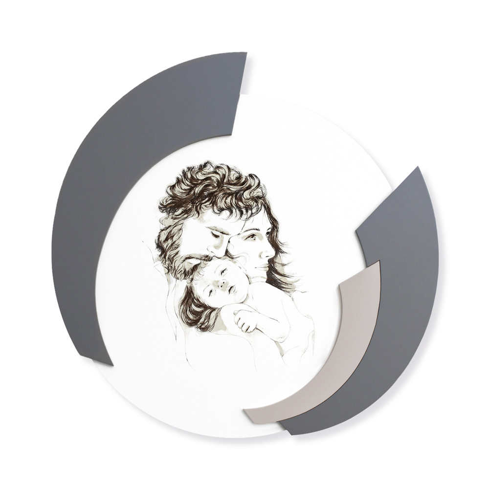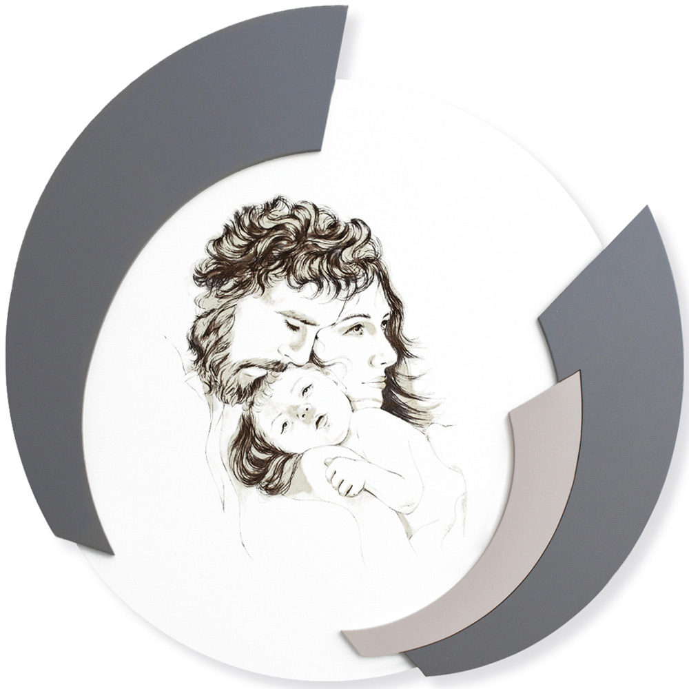 Een rond hoofdeinde dat het beeld van de Heilige Familie omsluit, omgeven door houten decoraties gelakt in de kleuren van uw keuze . Matwit gelakt houten paneel met lasermarkering, een speciale techniek die een bas-reliëf op de materialen creëert. Het originele handgemaakte ontwerp in combinatie met lasertechnologie geeft leven aan dit werk dat op verschillende niveaus is gegraveerd.