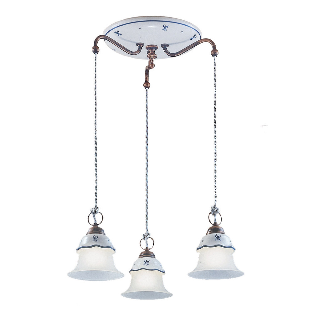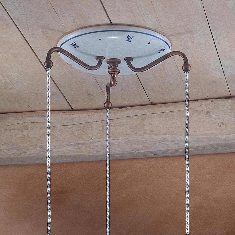 Hanglamp met 3 lampjes in ijzer, met de hand gedecoreerd keramiek en met zuur geëtst glas gemaakt in Italië door Ferroluce.