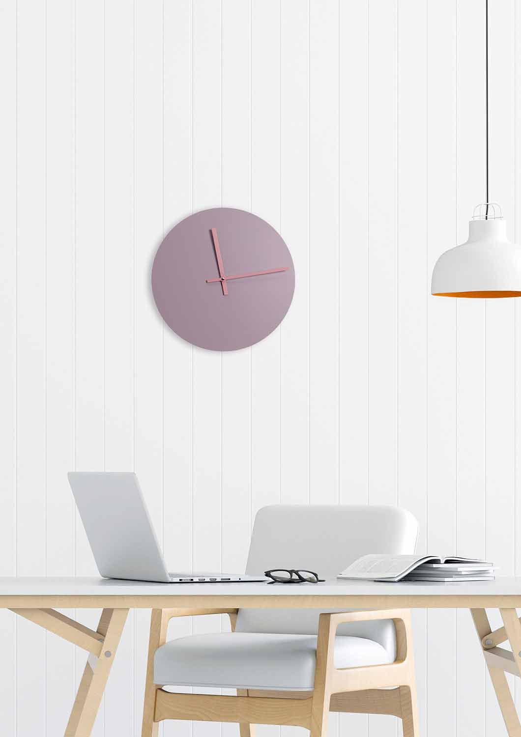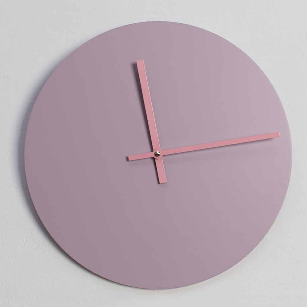 Ronde wandklok in roze kleur, modern design in hout, gemaakt in Italië.