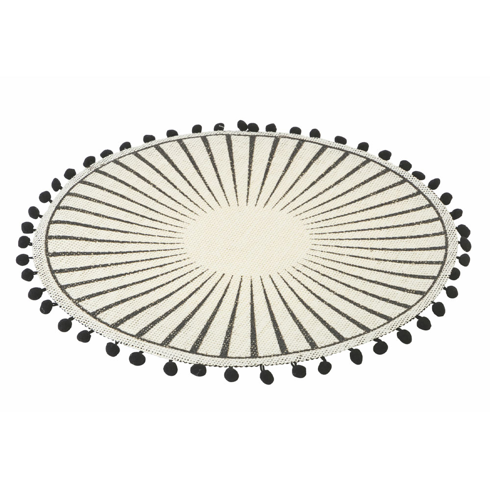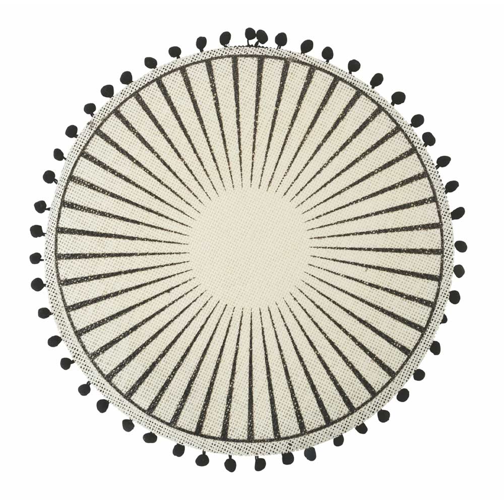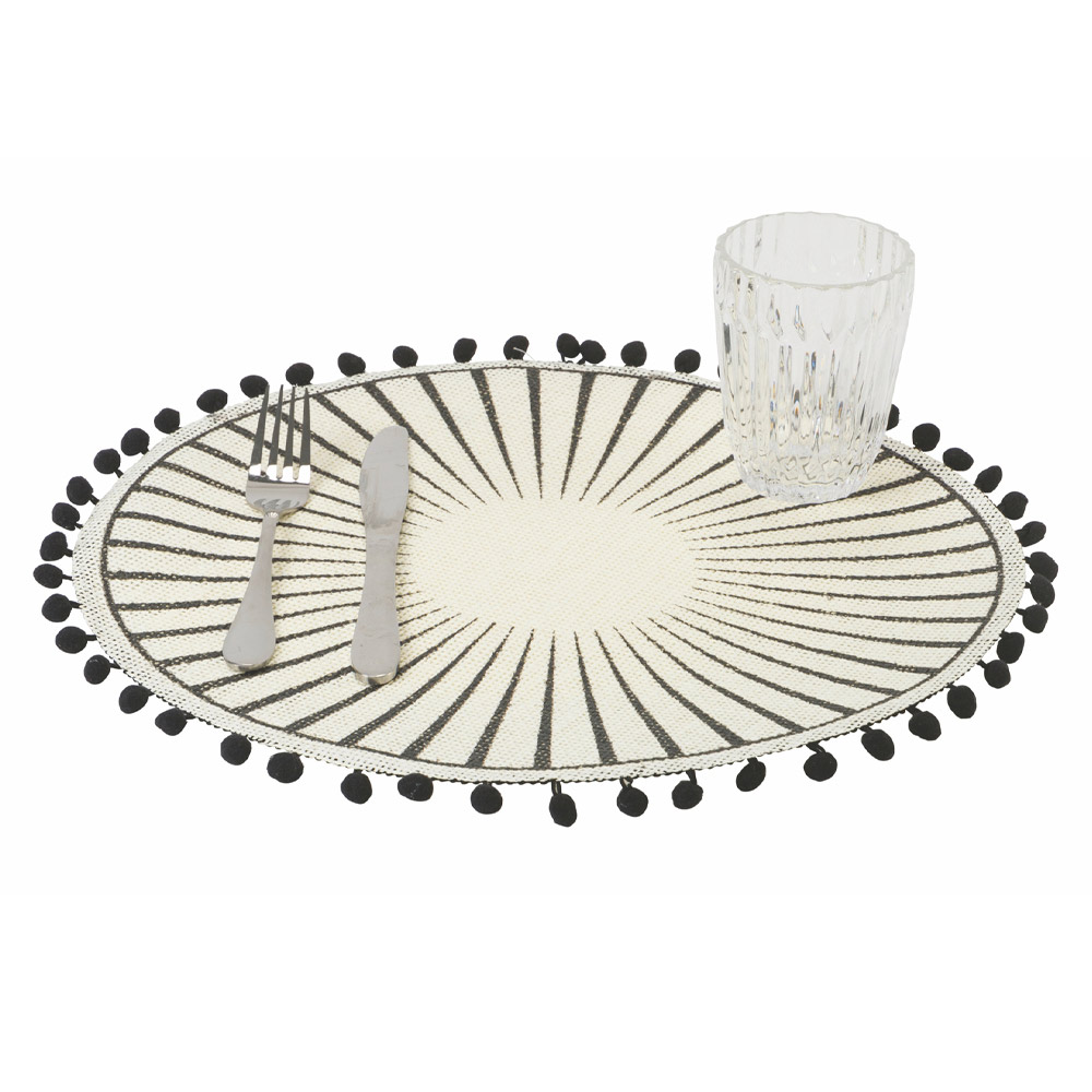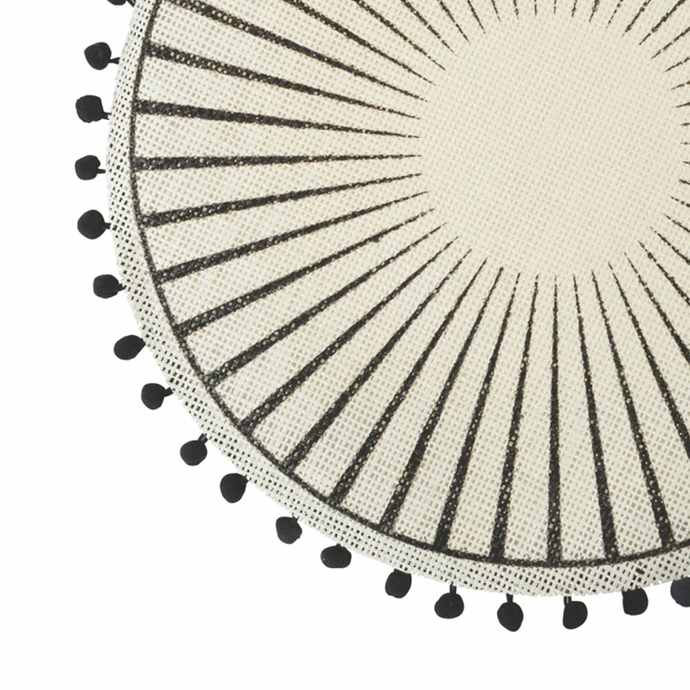 Ronde placemat set in witte jute versierd met zwarte pompons, 12 stuks.
