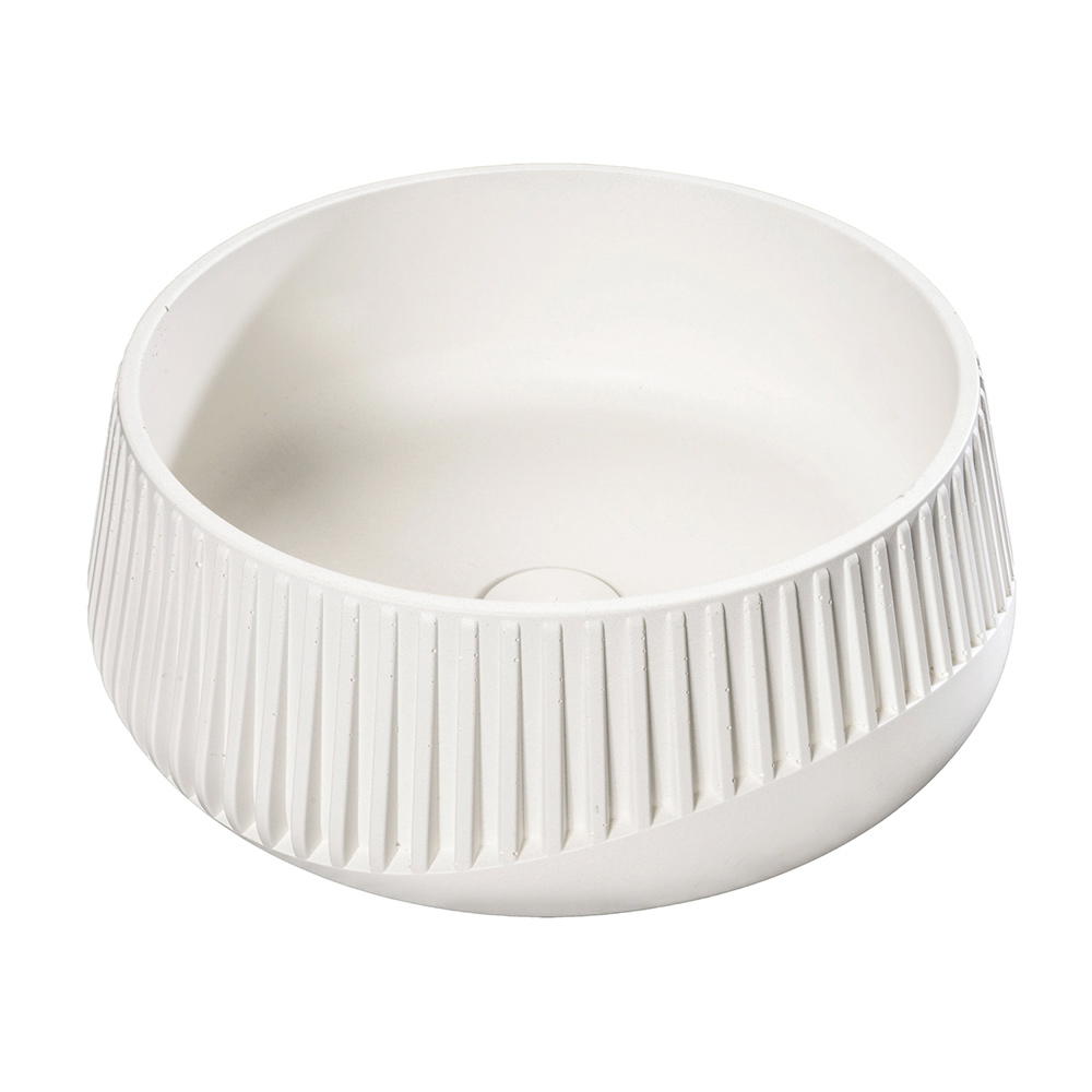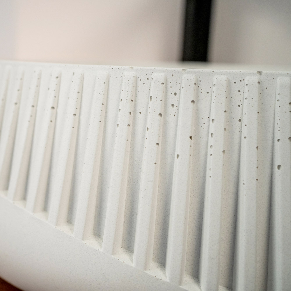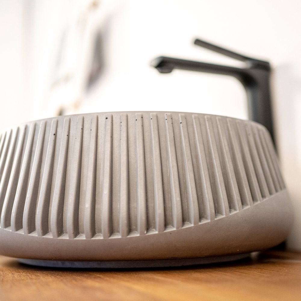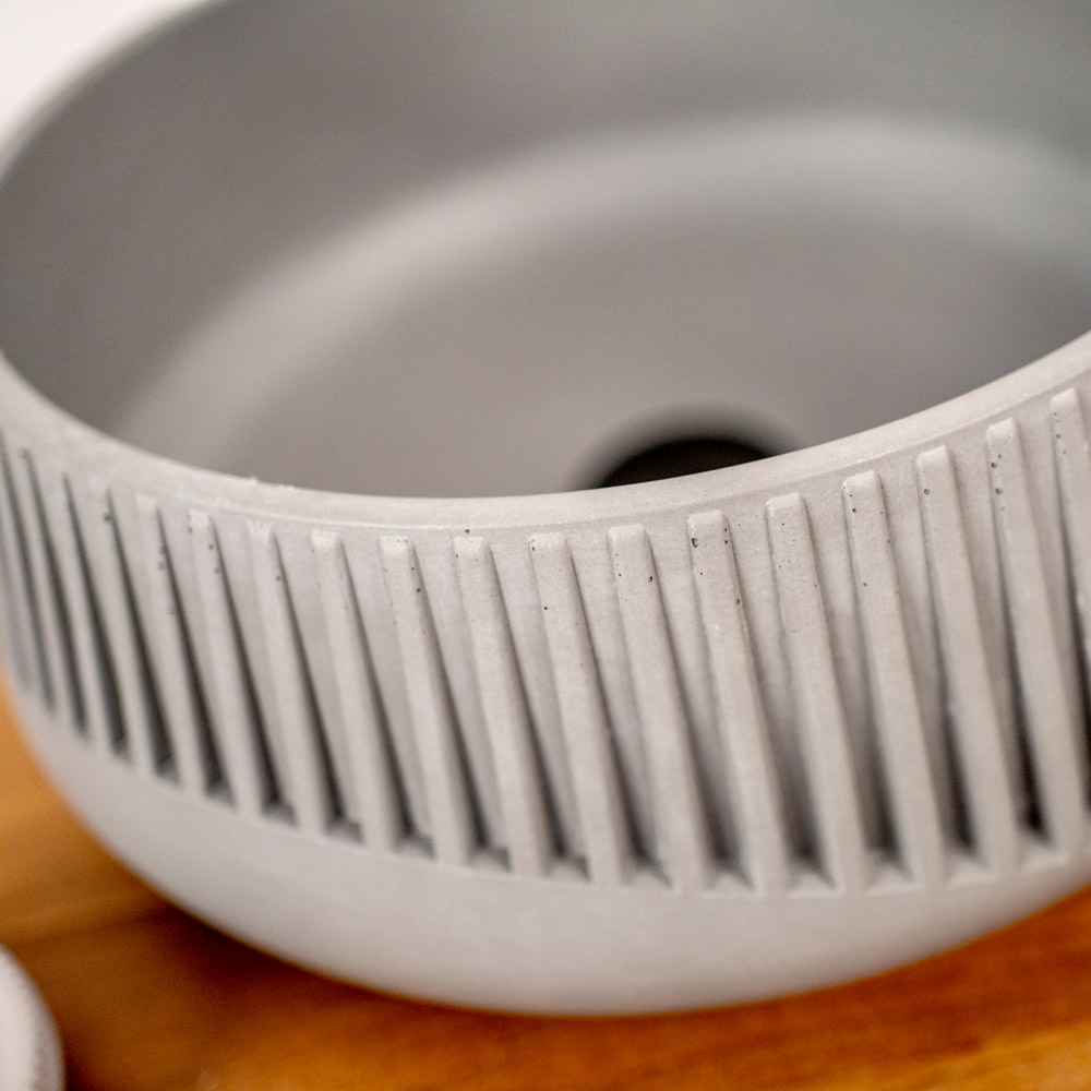 Deze opzetwastafel , perfect voor liefhebbers van de Urban Cottage of Industriële stijl, is sculptuur en functie in één object. De essentie ervan komt tot uiting in de externe microporiën en de schaduwrijke, authentieke kenmerken van het gebruikte cement. De externe afwerking, met nauwkeurige gravures, voegt een materiële toets toe. Deze wastafel is verkrijgbaar in twee afwerkingen en is een stijlstatement voor de durfals die willen opvallen.