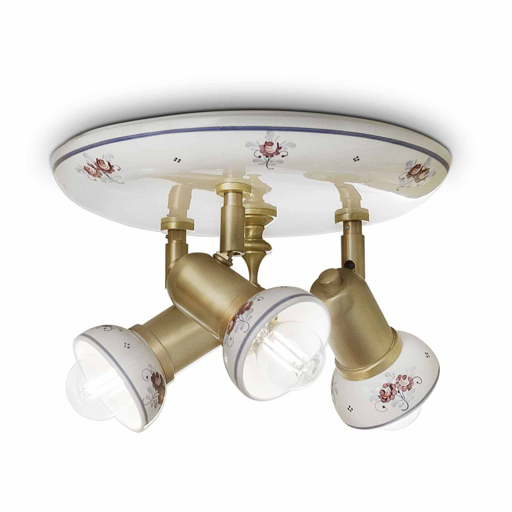 Ronde 3-lichts plafondlamp in messing en handbeschilderd keramiek, gemaakt in Italië door Ferroluce.