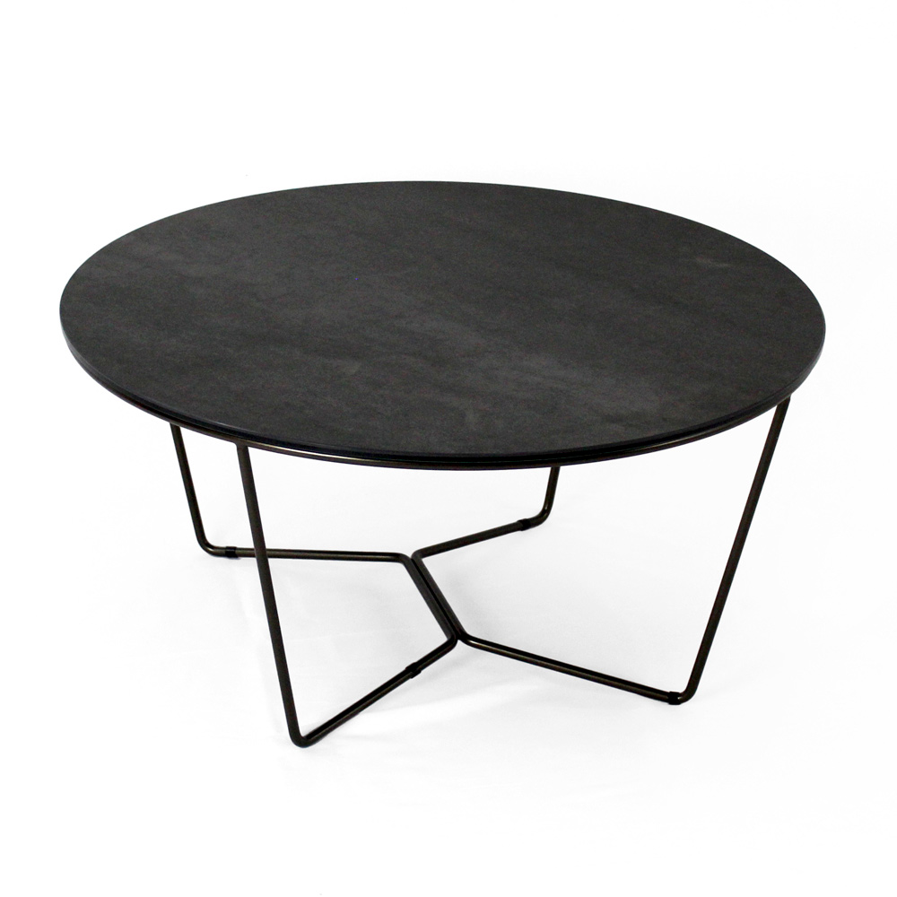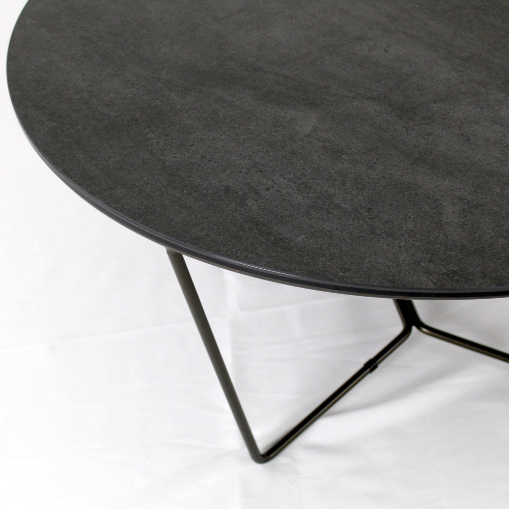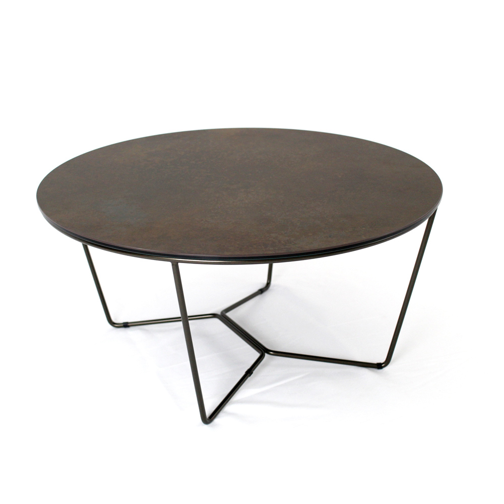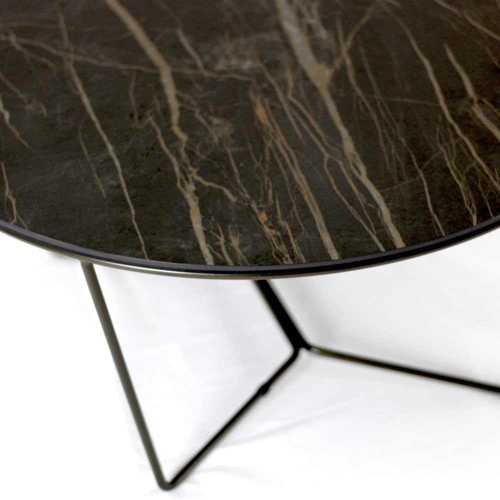 Ronde salontafel met gelakt stalen onderstel en porselein steengoed top.
