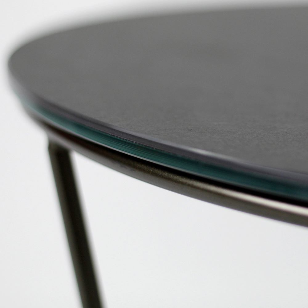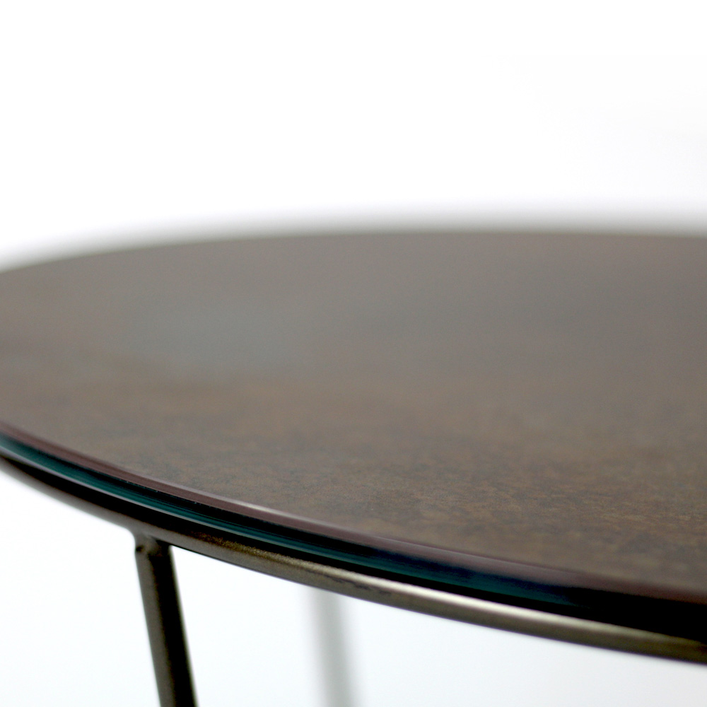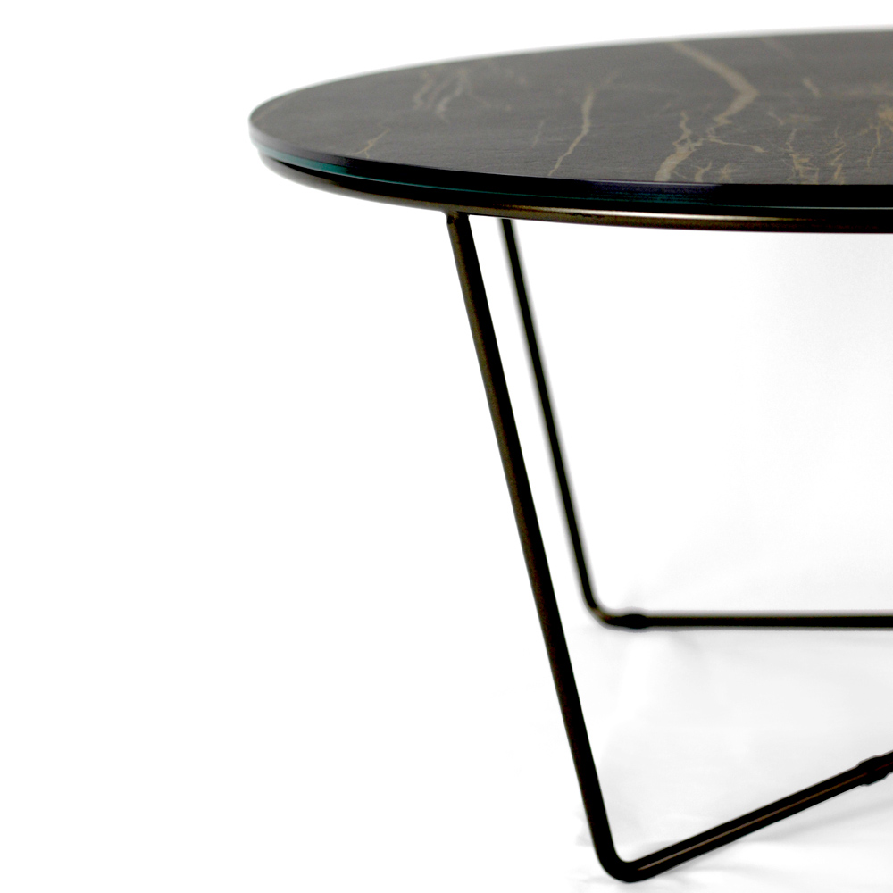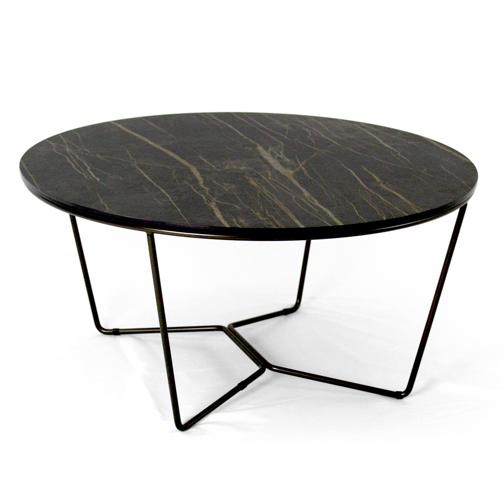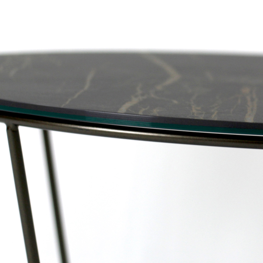Ronde salontafel met gelakt stalen onderstel en porselein steengoed top.