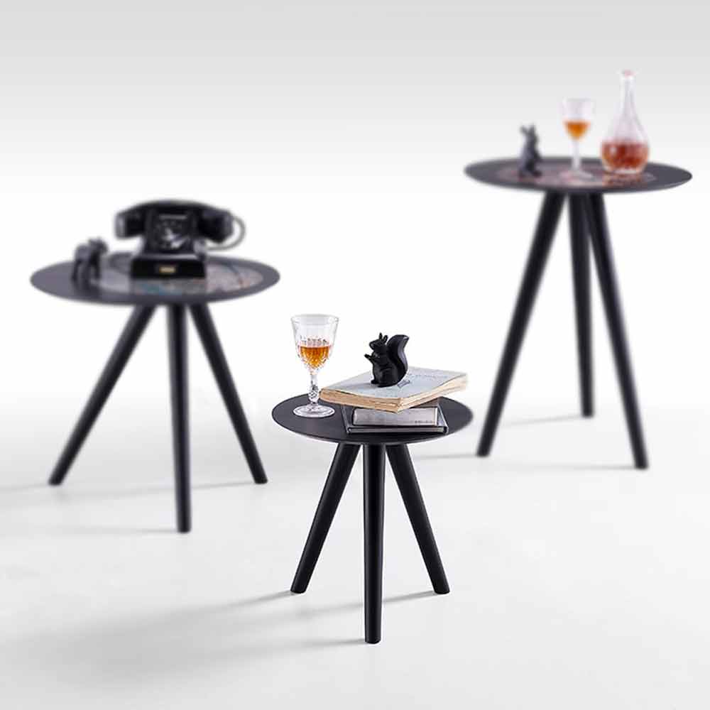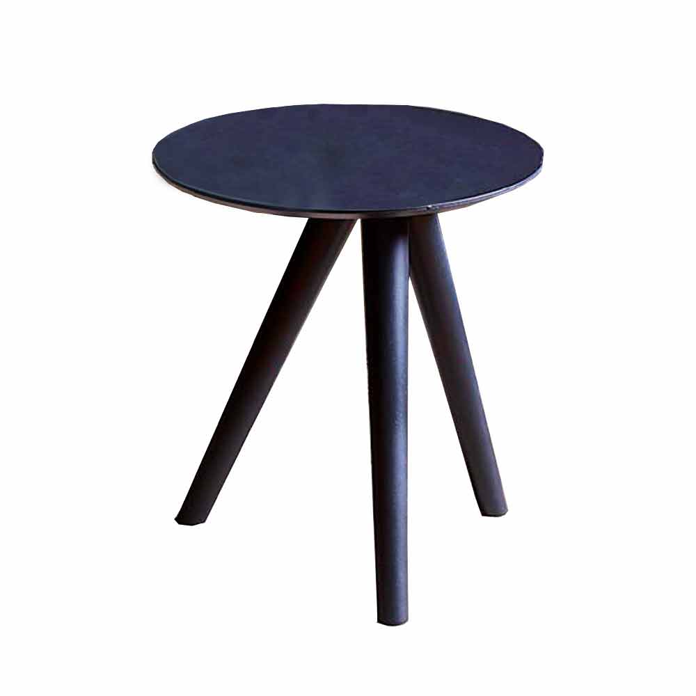 Salontafel in zwartgrijs gelakt beuken met 3-poots onderstel en 1,2 cm dik rond blad.
