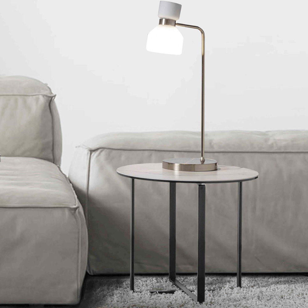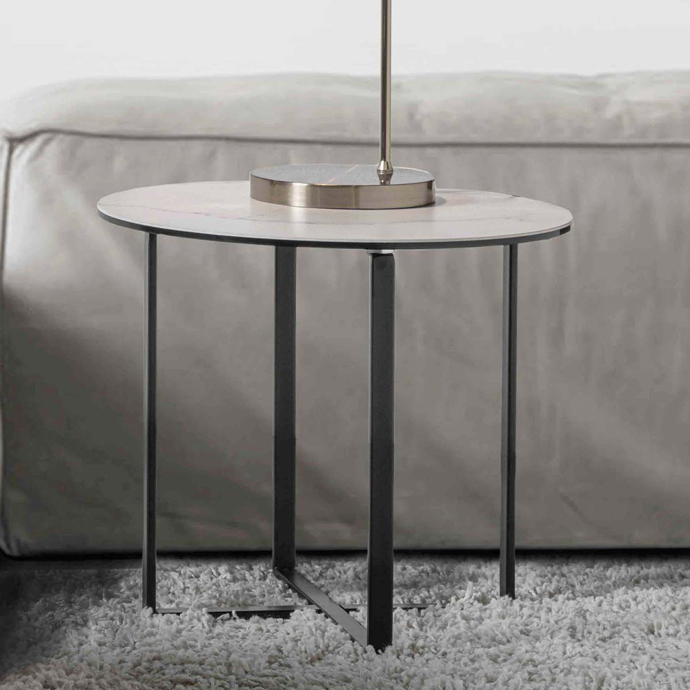 Moderne salontafel met rond blad van keramisch glas met wit marmeren afwerking en zwart gelakt metalen onderstel. Het ontwerp kan worden omschreven als eenvoudig en essentieel , perfect om elke woonkamer onopvallend af te ronden met moderne meubels. Wat de charme vergroot, zijn de gekozen materialen en afwerkingen, die erin slagen een bijzonder elegant en sober meubelstuk tot leven te brengen dat het uiterlijk van de kamer kan verrijken door te fungeren als een praktisch steunvlak voor drankjes, boeken, tijdschriften of elk ander object. die je bij de hand wilt houden en tegelijkertijd als geraffineerd decoratief element.