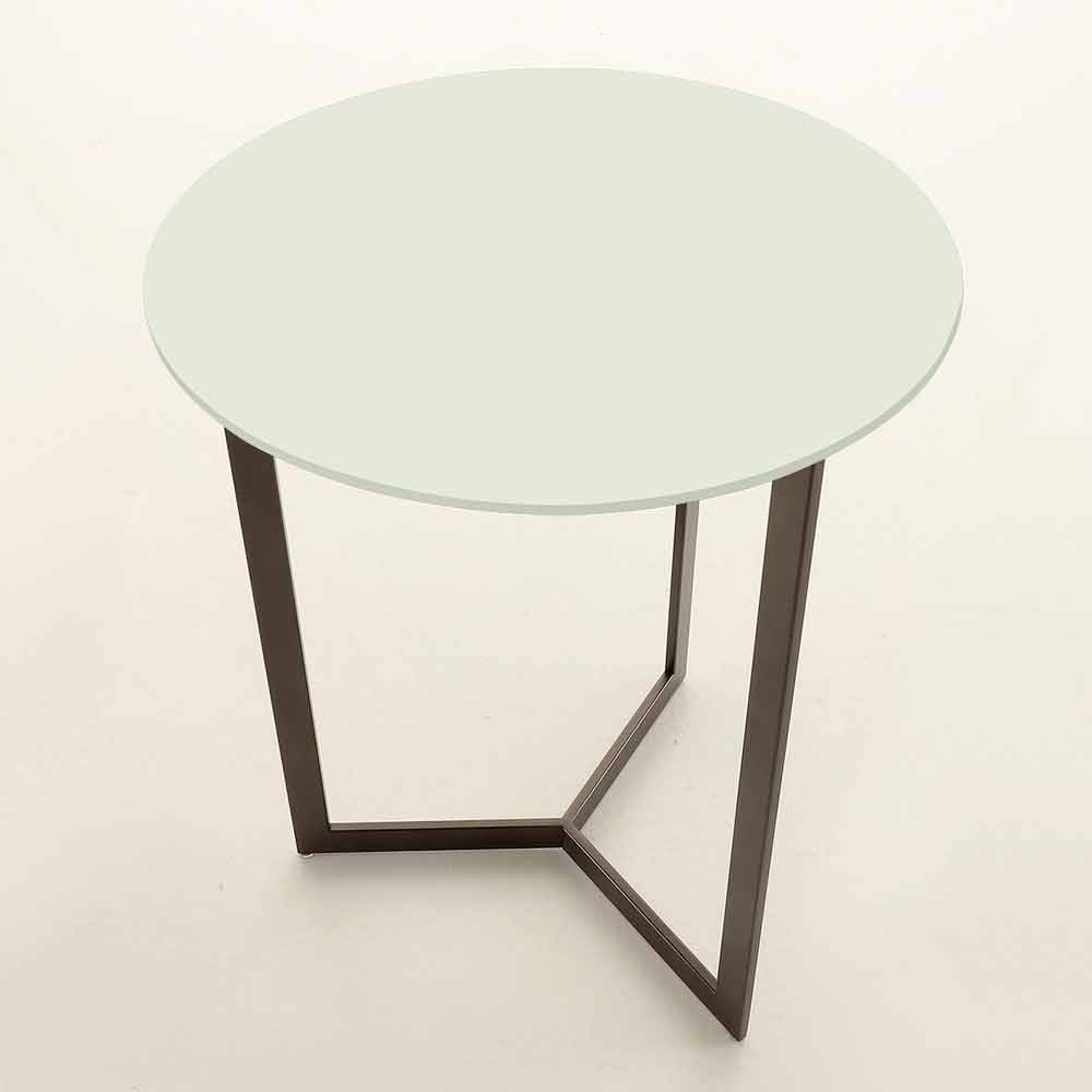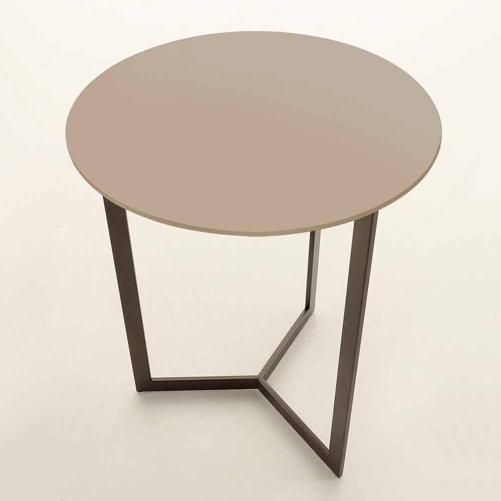 Eenvoudige en elegante salontafel gemaakt in Italië met rond blad van anti-vingerafdruk gesatineerd glas en structuur in bruin geverfd metaal .