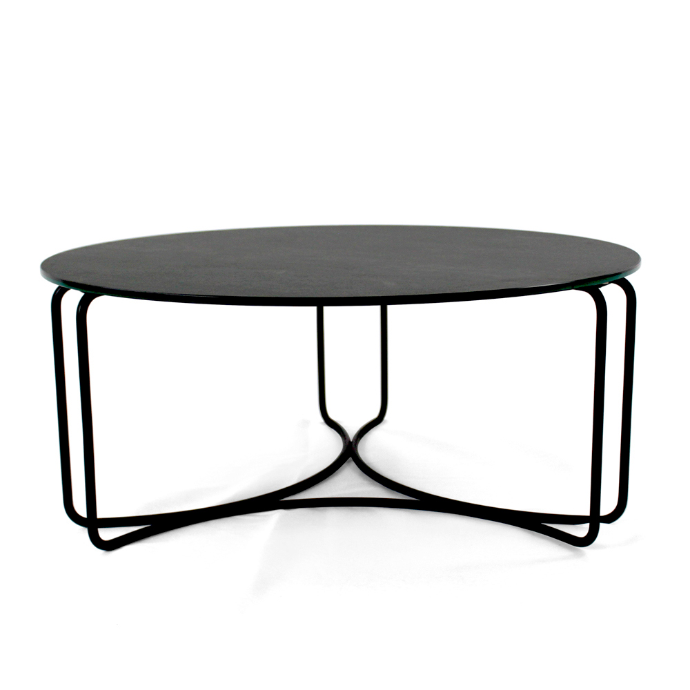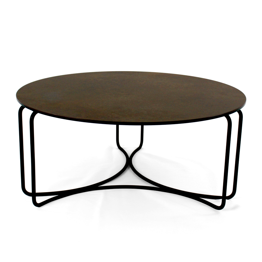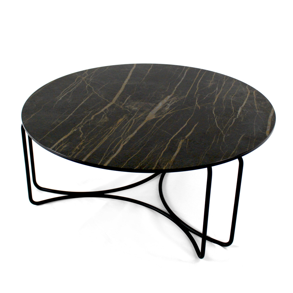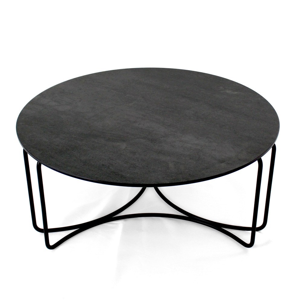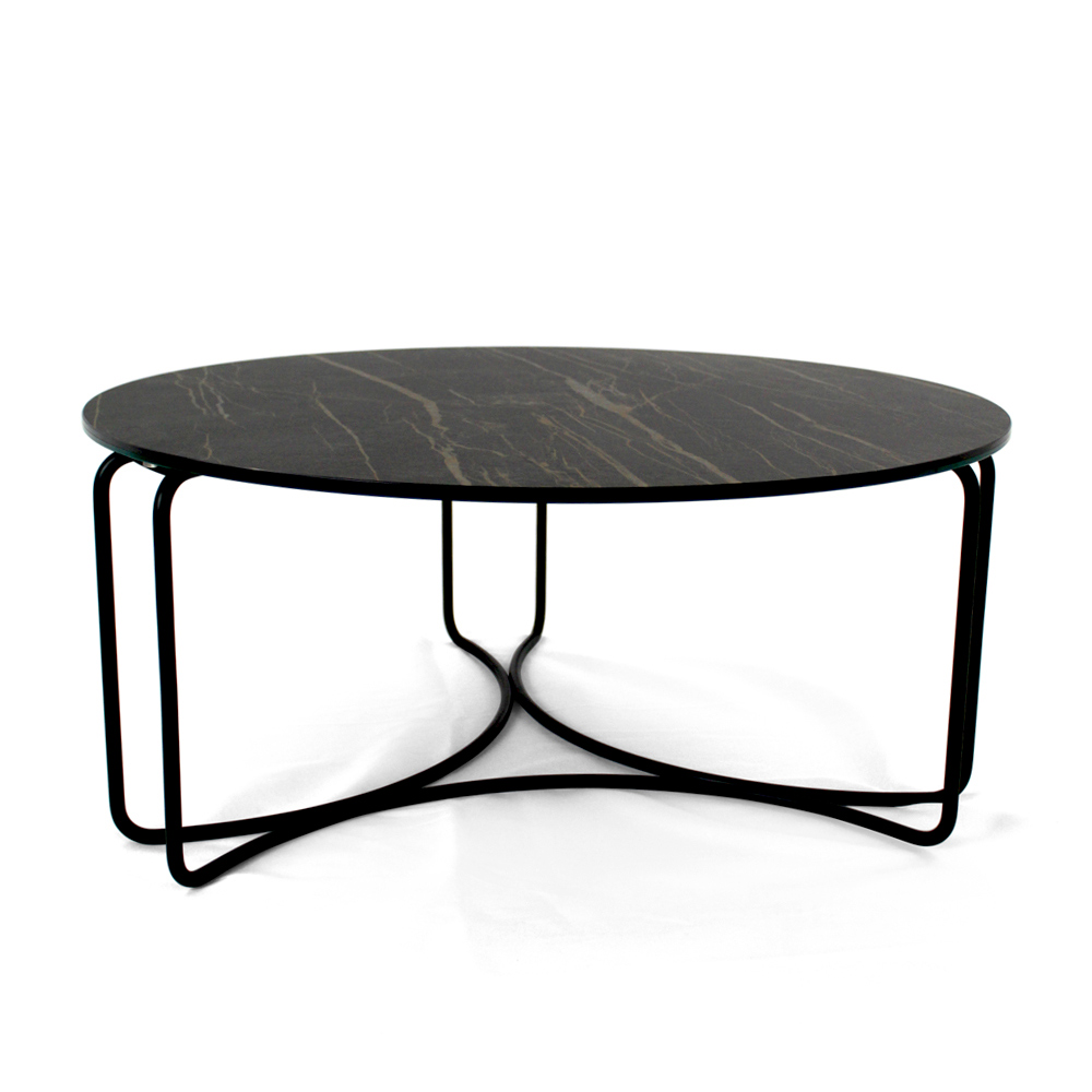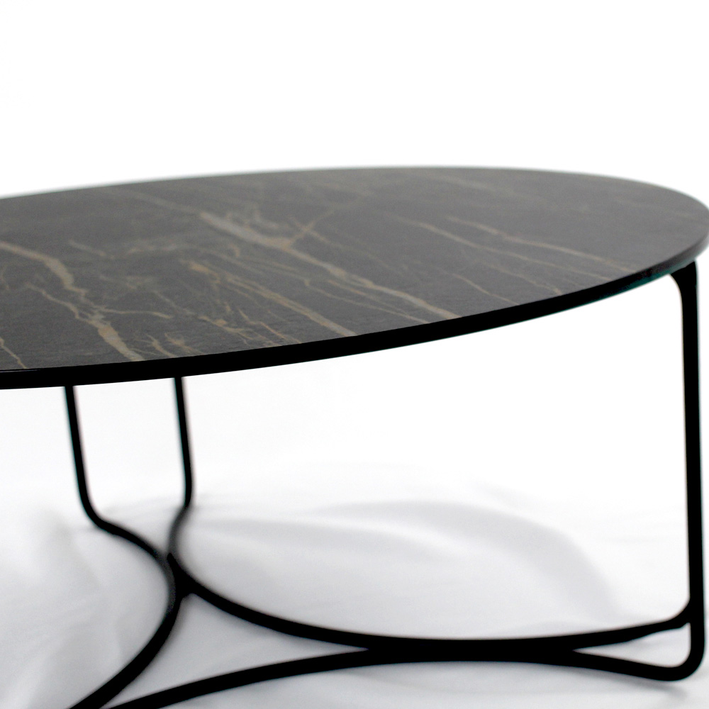 Ronde salontafel met gelakt stalen onderstel en porselein steengoed top.