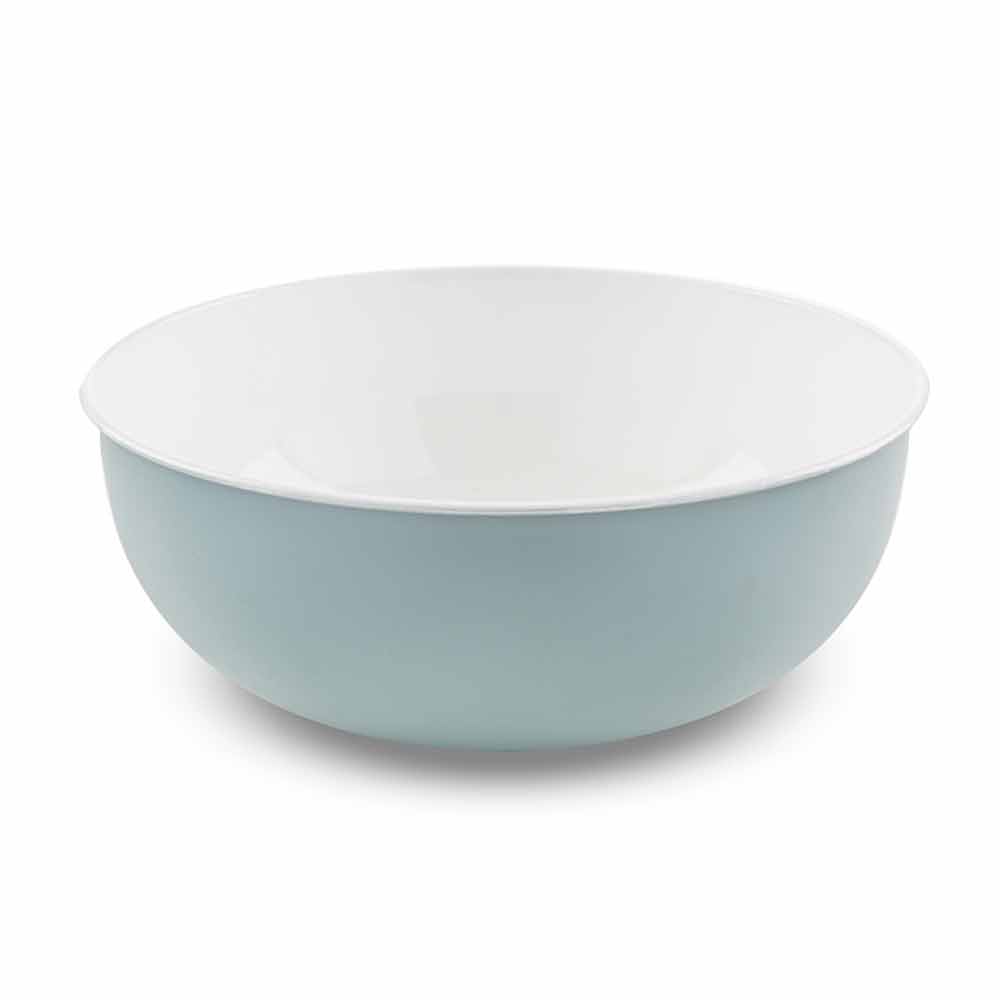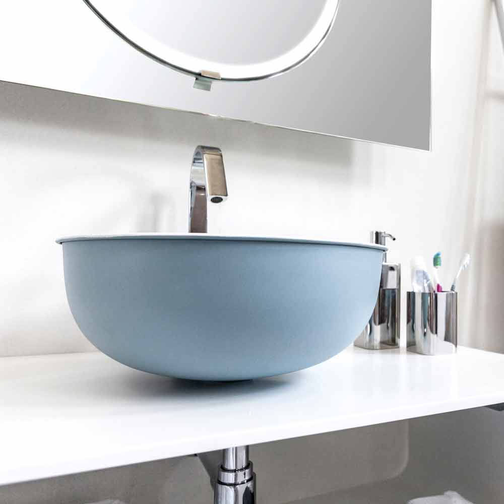 Aanrechtblad van metaal met kom. Inwendig glanzend wit geglazuurd, uitwendig mat gekleurd met ruw effect. De “gekrulde” bovenrand geeft de wastafel meer stevigheid en is makkelijk schoon te maken.