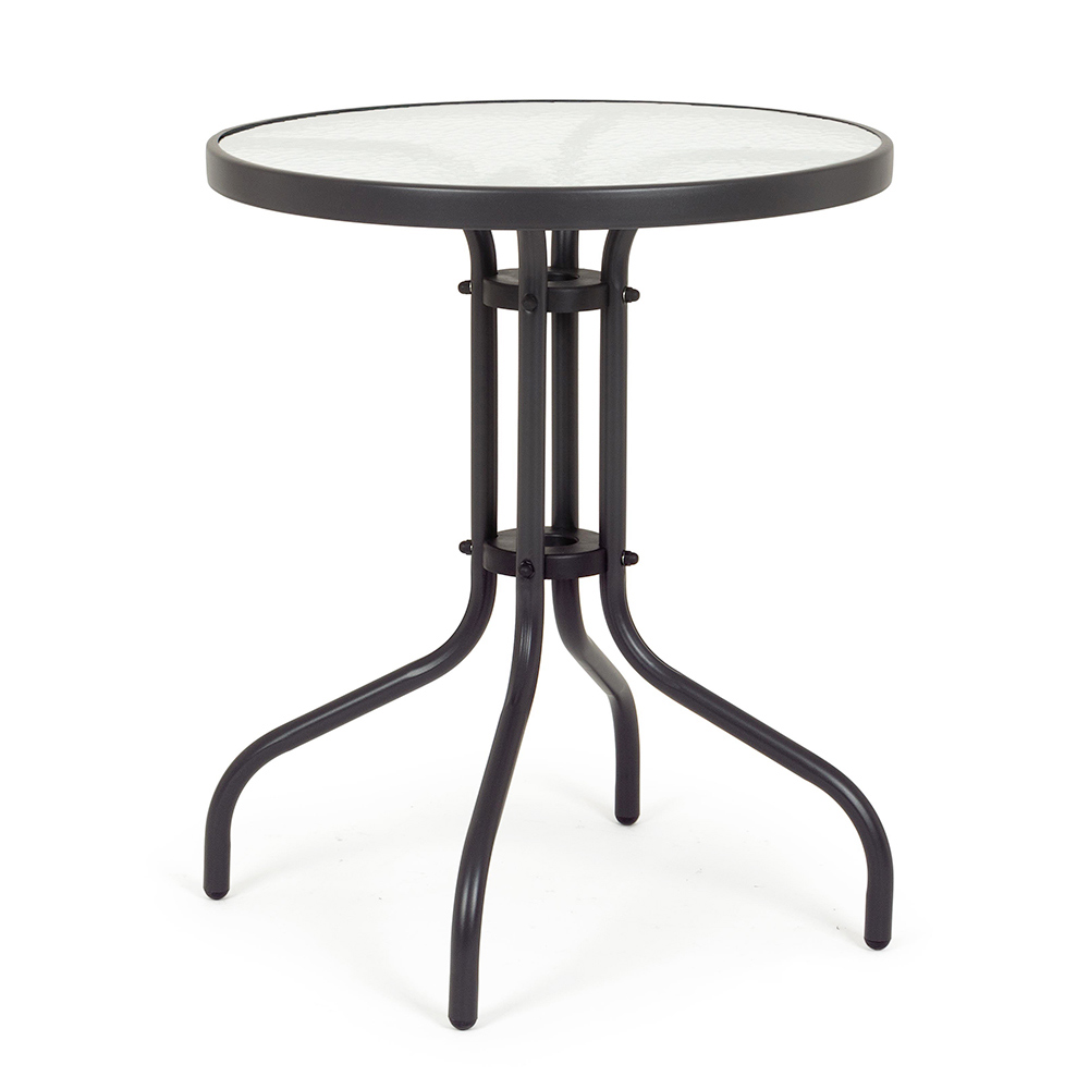 Ronde stalen buitentafel met glazen blad, tuinitem.