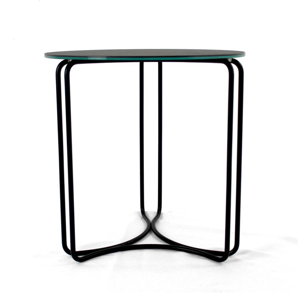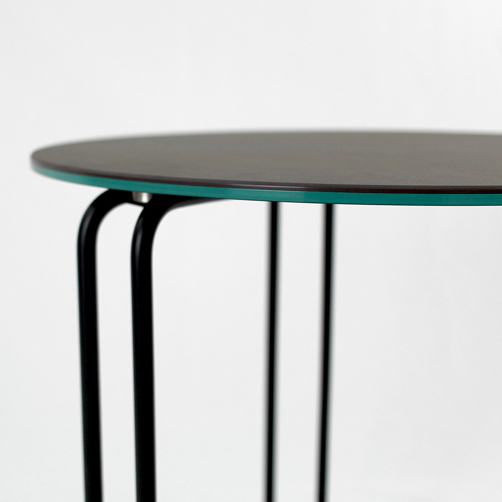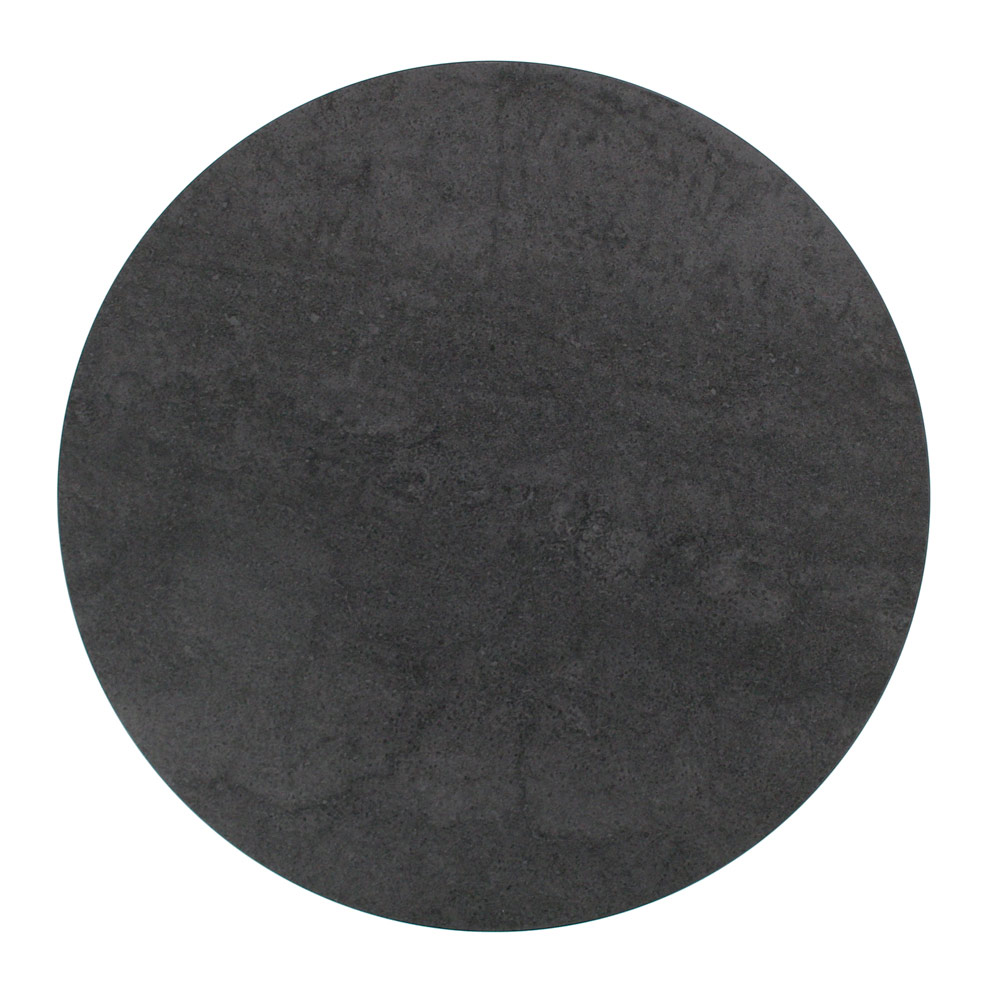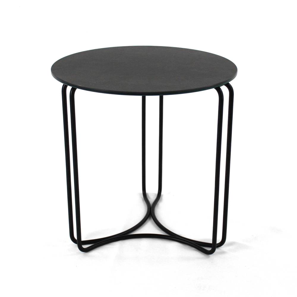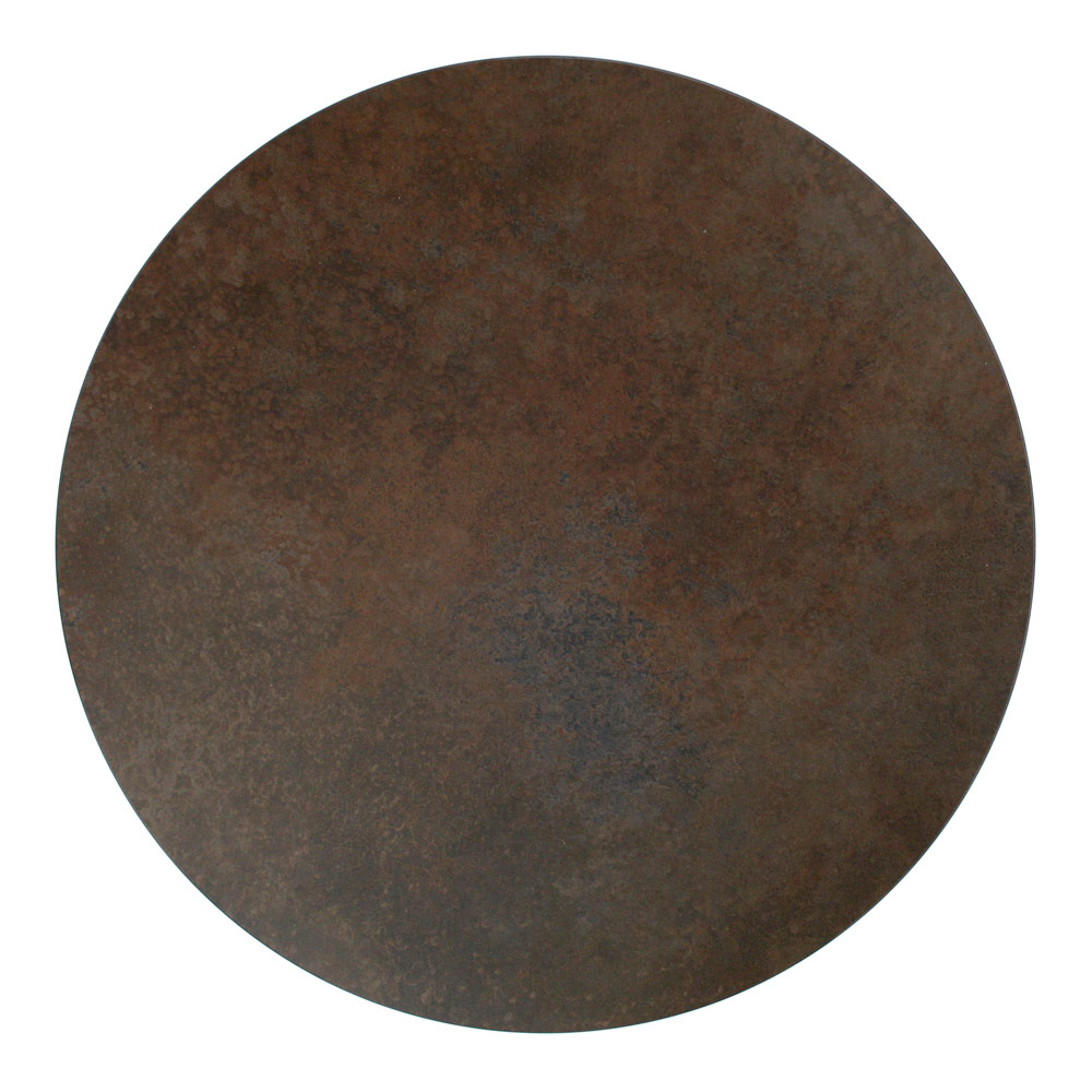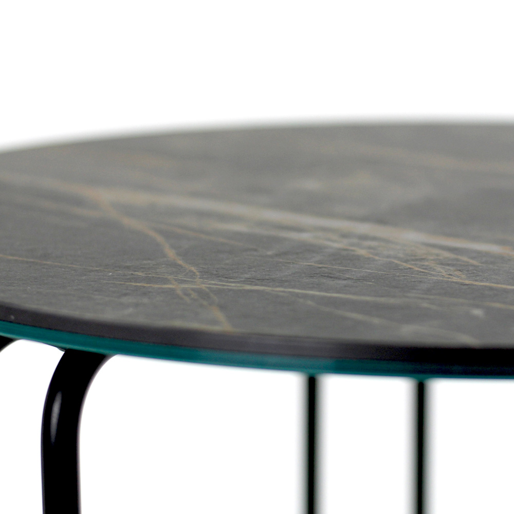 Ronde salontafel met gelakt stalen onderstel en porselein steengoed top.