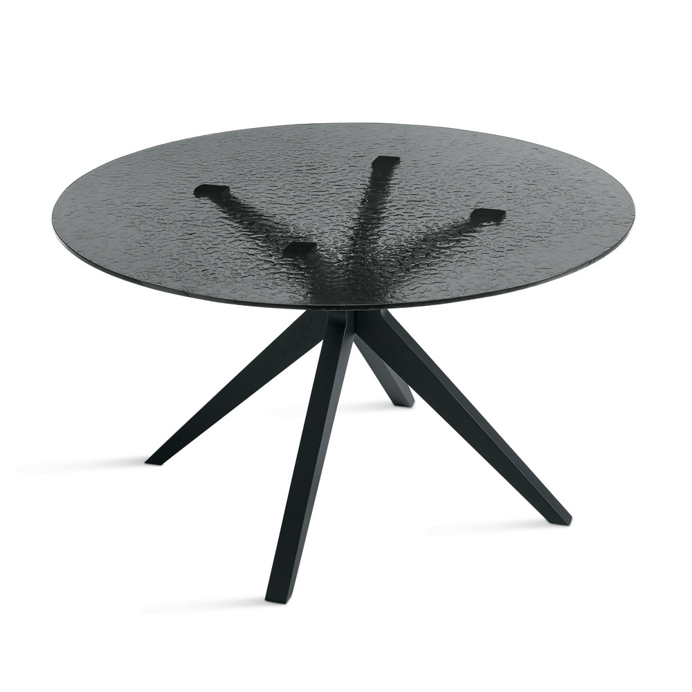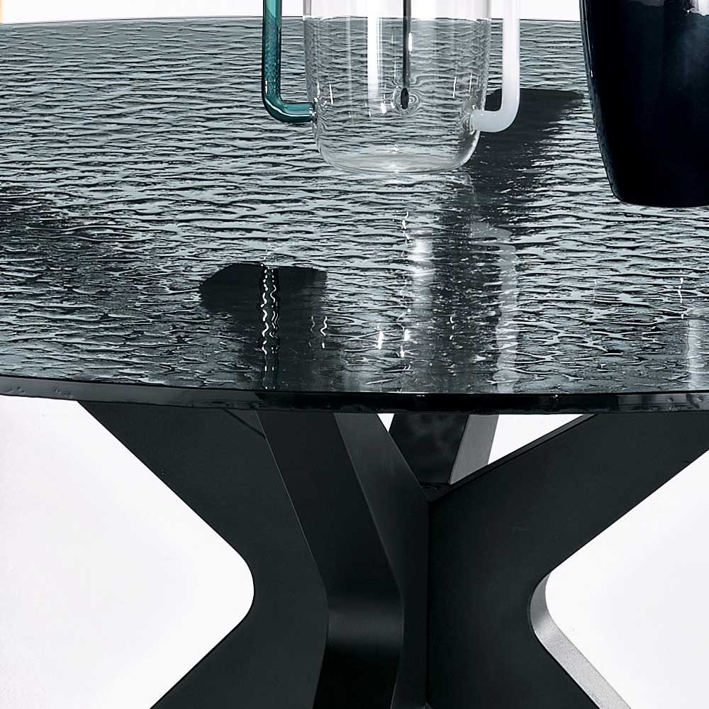 Een elegante ronde eettafel met een eigentijds design, ideaal om een stijlvolle touch aan uw eetkamer of woonkamer te geven. Het tafelblad is gemaakt van gerookt, gehamerd glas , een verfijnde afwerking die een uniek textuureffect creëert en de ruimte visuele diepte geeft.