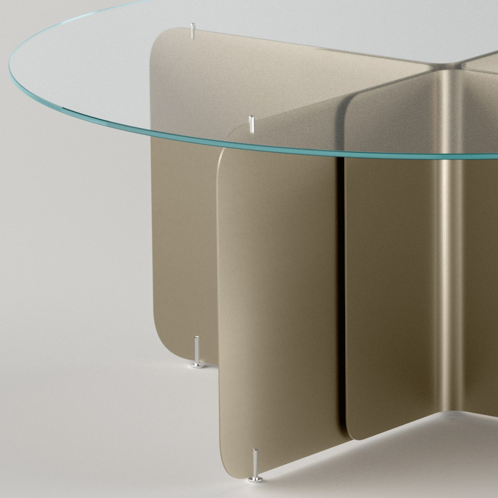 Deze tafel is een betoverende mix van minimalistische elegantie en eigentijdse functionaliteit , perfect voor wie op zoek is naar een onderscheidend en toch discreet meubelstuk. Het transparante glasoppervlak biedt een volledig zicht op de onderliggende structuren, waarbij de geometrische basissen in champagnetinten goed tot hun recht komen.