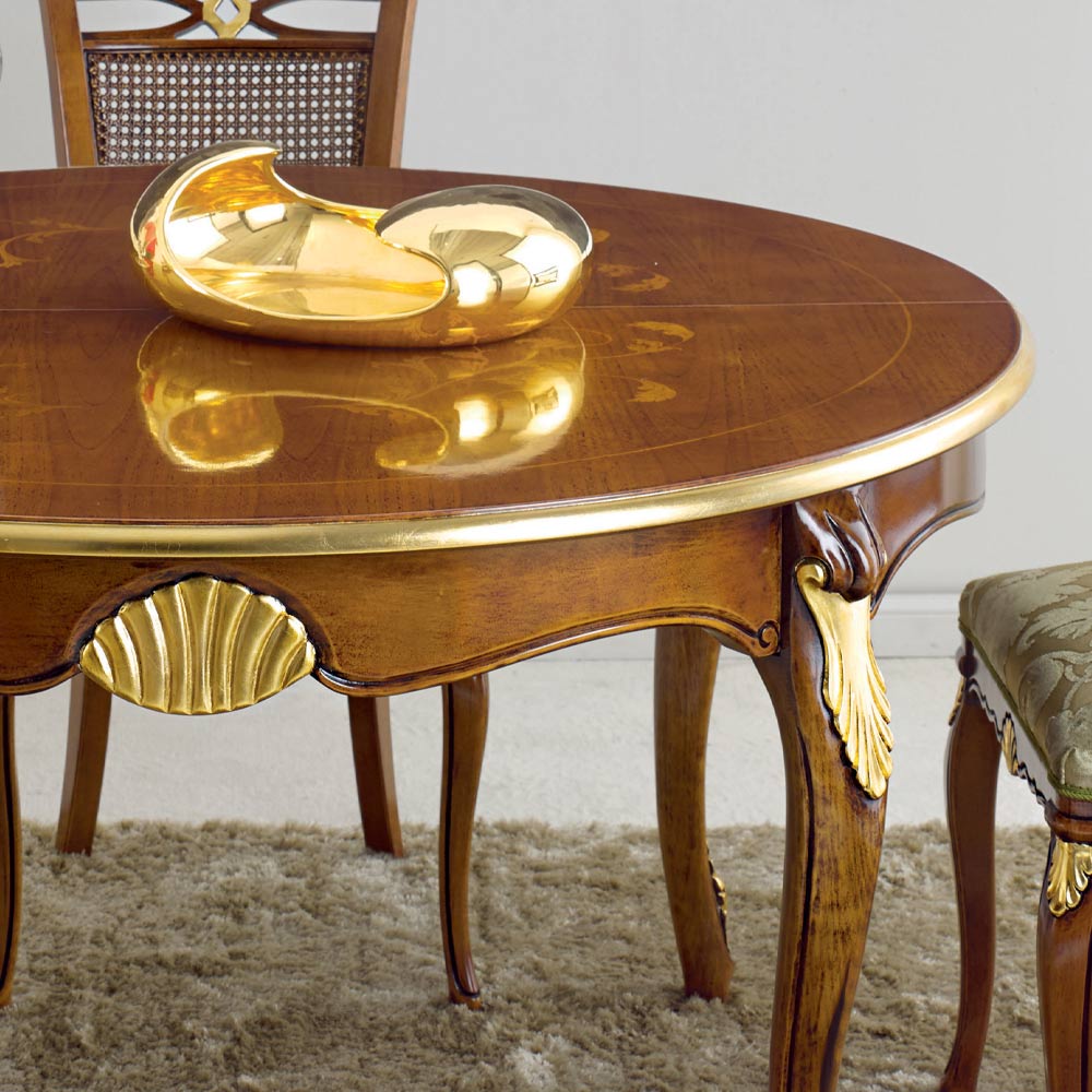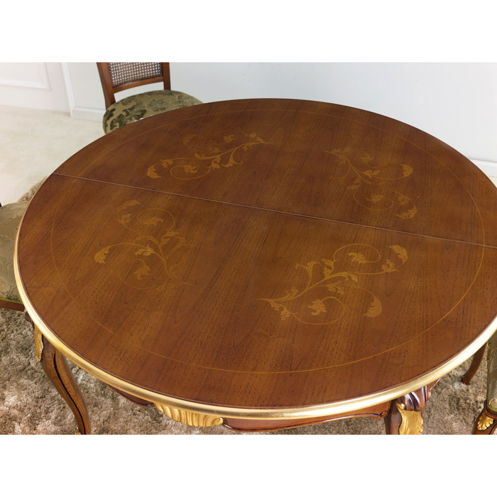 Eettafel met rond blad uitschuifbaar tot 240 cm dankzij twee interne verlengingen van 50 cm, volledig gemaakt van hout en verkrijgbaar in Bassano walnoot en antiek goud of wit en zilver houtafwerkingen.